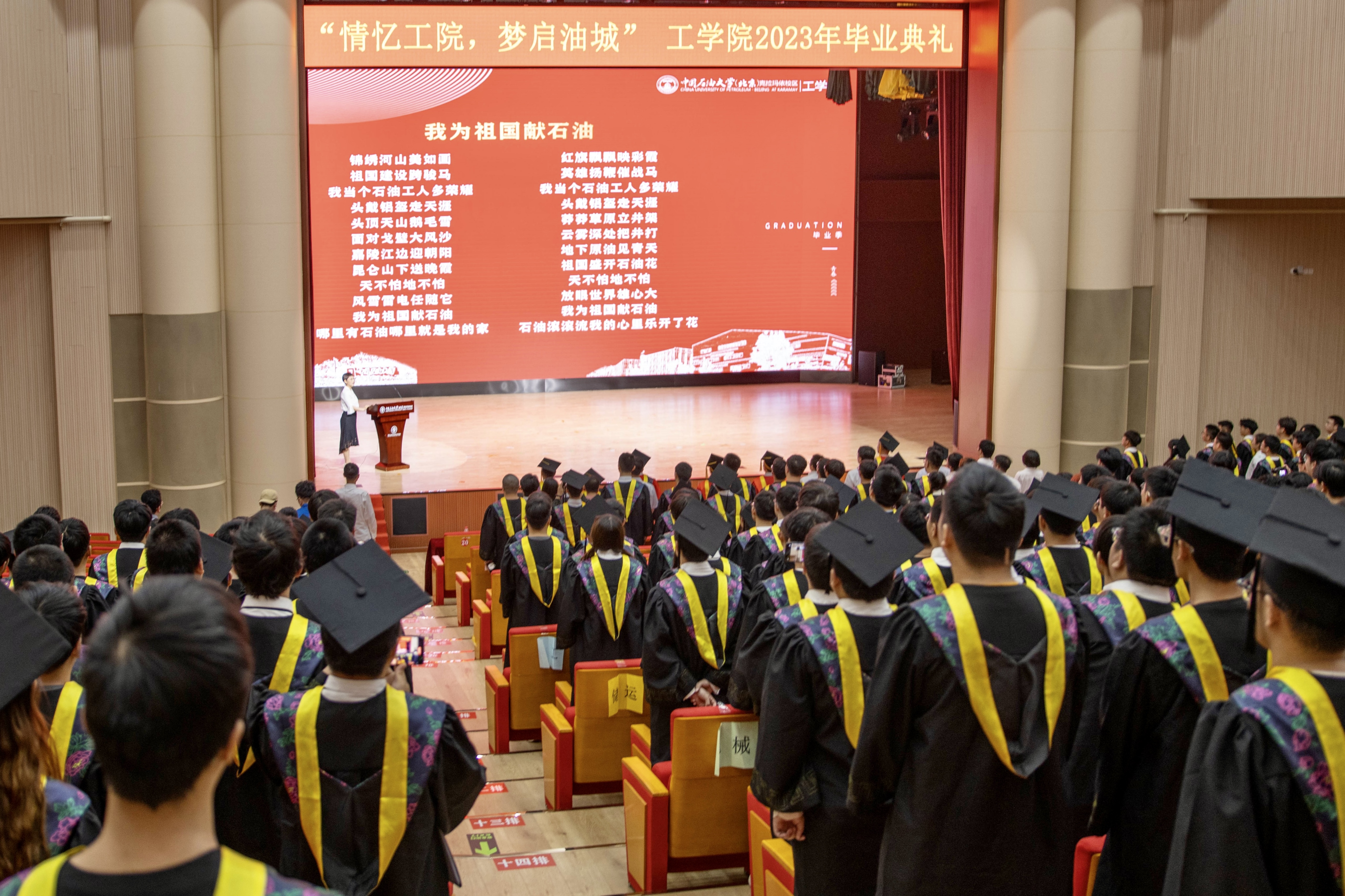 典礼最后,全体毕业生合唱《我为祖国献石油》,歌声响彻全场。修诗书以致学,赋青春以壮怀,未来在新的旅途上,祝愿每位中石大学子挂云帆与沧海,颂雅致于高台,初心坚定,前程似锦!