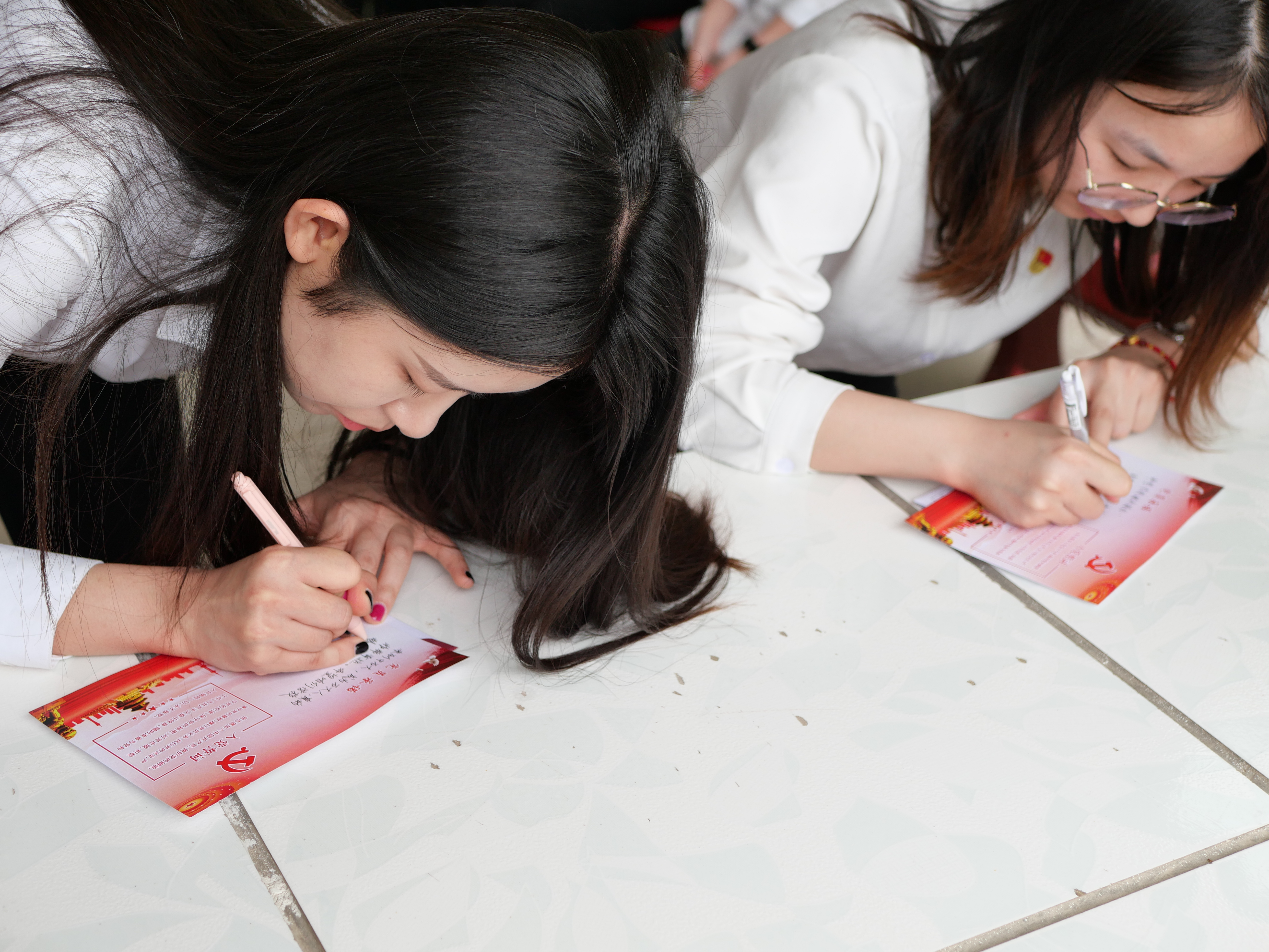 首先由团总支书记新立发放并宣读了“致毕业生党员的一封信”,信中从“文明离校”、“爱校荣校”、“增强党性,牢记身份”以及“积极履行党组织关系义务”四个方面表达了对毕业生党员的祝福和期望,感谢毕业生党员一直以来的付出和努力,同时也呼吁每位毕业生党员永远不要忘记初心和使命,发扬党员先进性,树立良好形象,为中国特色社会主义伟大事业作出贡献。