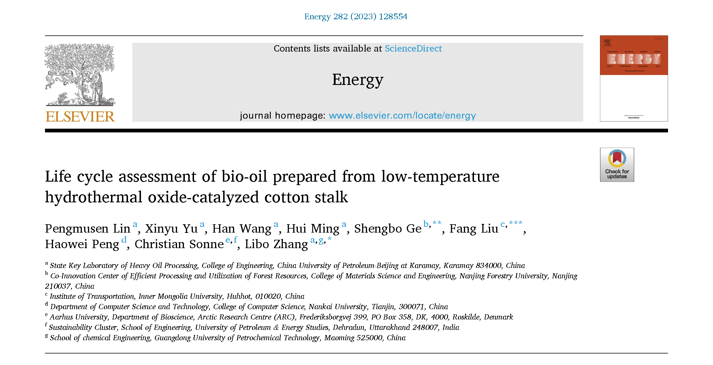 近日,我校工学院2020级化学工程与工艺专业林彭慕森在中科院一区Top期刊Energy(IF=9)以第一作者身份发表了题为“Life cycle assessment of bio-oil prepared from low-temperature hydrothermal oxide-catalyzed cotton stalk”的研究论文(DOI: 10.1016/j.energy.2023.128554)。论文第一通讯作者为化工与环境系张立波副教授。本研究工作获得了新疆维吾尔自治区自然科学基金 (2022D01F60, 2021D01B120),新疆维吾尔自治区天山英才 (2022TSYCJC0001)等项目资助。