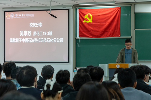 弦歌不辍叙七秩,诚邀校友话未来。本次组织生活同时邀请到原化工专业19级校友吴宗政与大家分享对母校70年华诞的祝福。吴宗政现就职于中石油克拉玛依石化有限责任公司,他结合毕业后的就职体验畅谈了自己的成长感悟:“学习是没有尽头的。班组里有一些老师傅从业已经十多年,对装置掌握十分熟悉,但是他们仍然要学习,参加培训,提升自己,让我再一次认识到学无止境,活到老,学到老。”吴宗政表示离开母校后,总是怀念在校区学习生活的点点滴滴,勉励在校同学珍惜大学生活,加强体育锻炼,增强综合实力。分享最后,吴宗政对母校和学院的培养表达真挚的感谢,在母校70周年校庆之际,祝愿母校继往开来、砥砺奋发,培养出更多可堪大用、能担重任的国家栋梁。