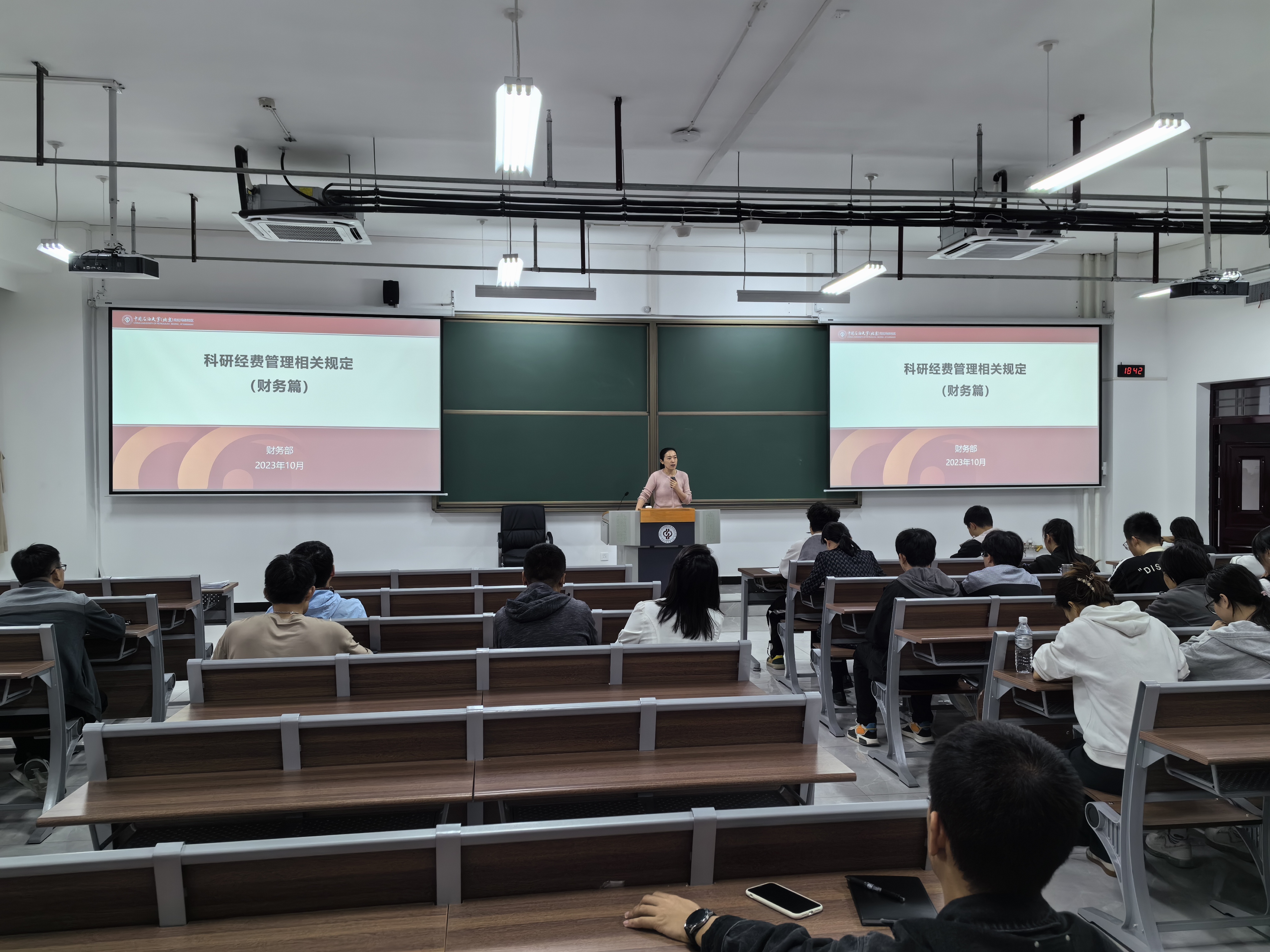 闫骏从项目类型及预算控制、科研项目票据使用管理、科研项目经费管理、财务报销票据规定、财务报销支付结算规定、科研经费报销清单制这六个方面,向学院老师全面、详细地讲解了《科研经费管理相关规定》。并解答了部分老师对科研经费使用的问题。