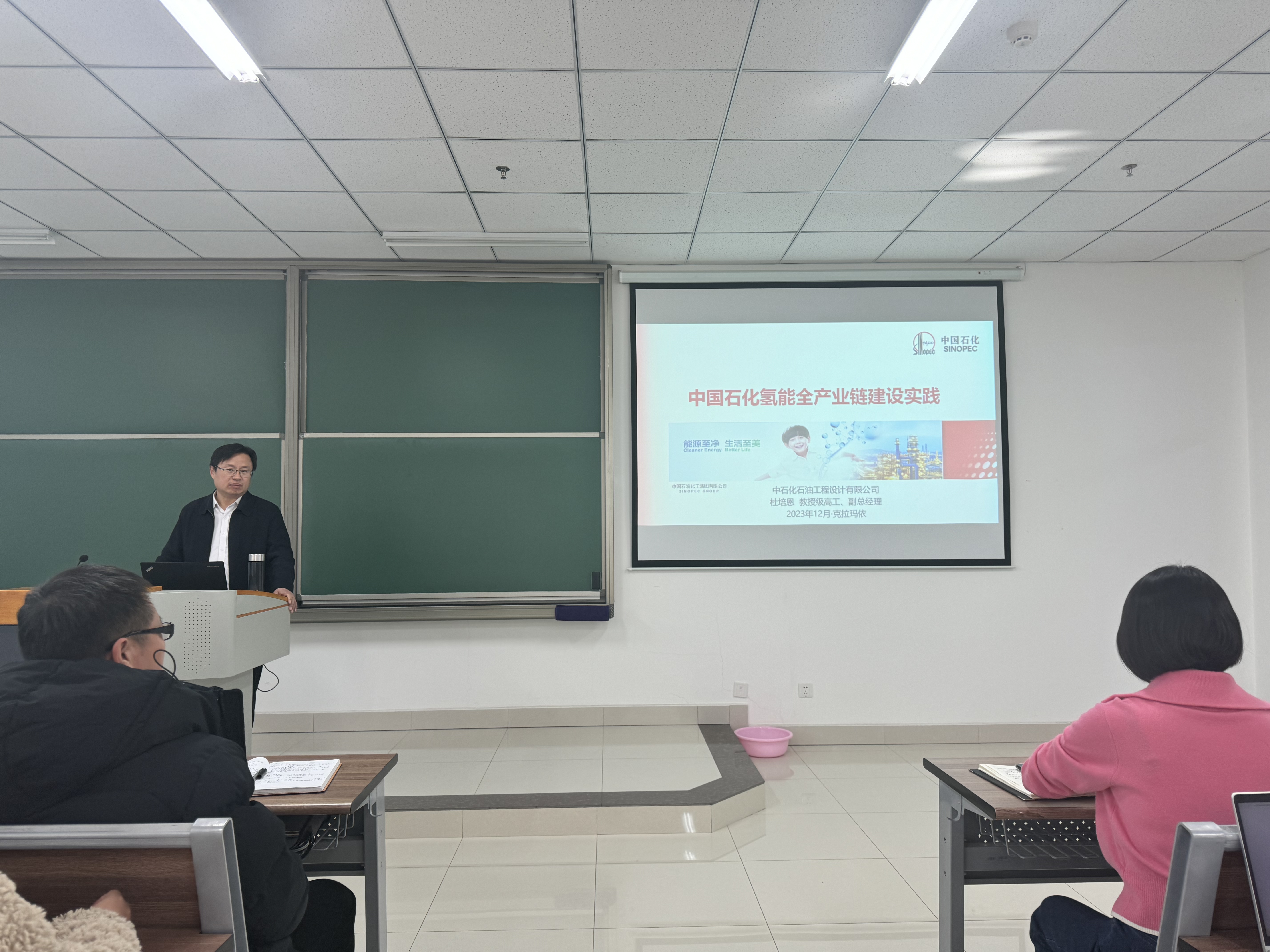 12月13日上午,第十六期油气储运工程系列讲座在C8楼I区214教室举办,本次讲座由自治区“天山英才”邢晓凯名师工作室组织主办。中石化石油工程设计有限公司副总经理、教授级高级工程师杜培恩受邀开展了题为“中国石化氢能全产业链建设实践”的专题讲座,工学院近百名师生通过线上、线下方式参加,讲座由工学院储运与自动化系专业负责人李欣泽主持。