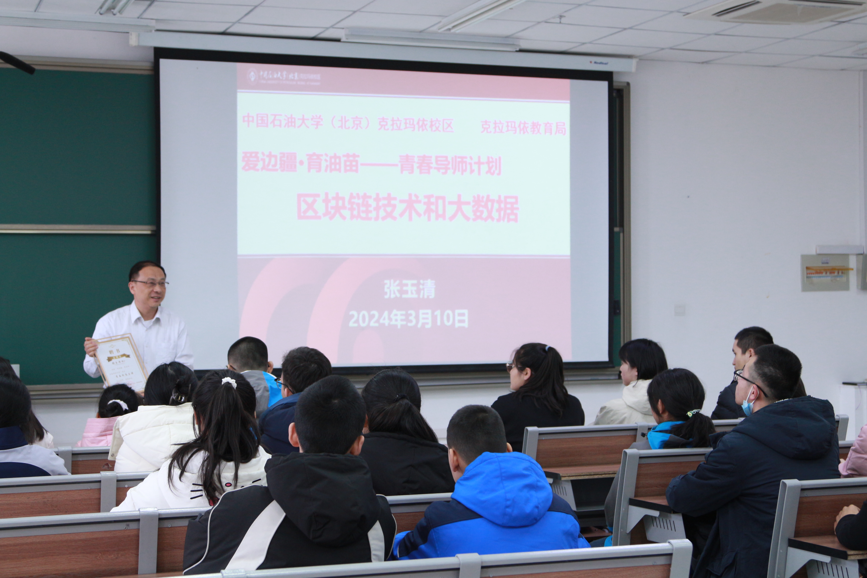 第十一期中组部援疆干部、中国石油大学(北京)克拉玛依校区工学院副院长张玉清副教授做了题为《区块链技术和大数据》的主题报告。报告深入浅出地阐释了区块链和大数据技术的概念和内涵,结合自身的科研经历,通过视频展示、案例分享和互动讨论等多种形式,张老师向“油苗”们展现了这些热点信息技术的现状和发展前景,鼓励“油苗”们努力提高科学素养,树立“科技创新、强国有我”的远大志向。