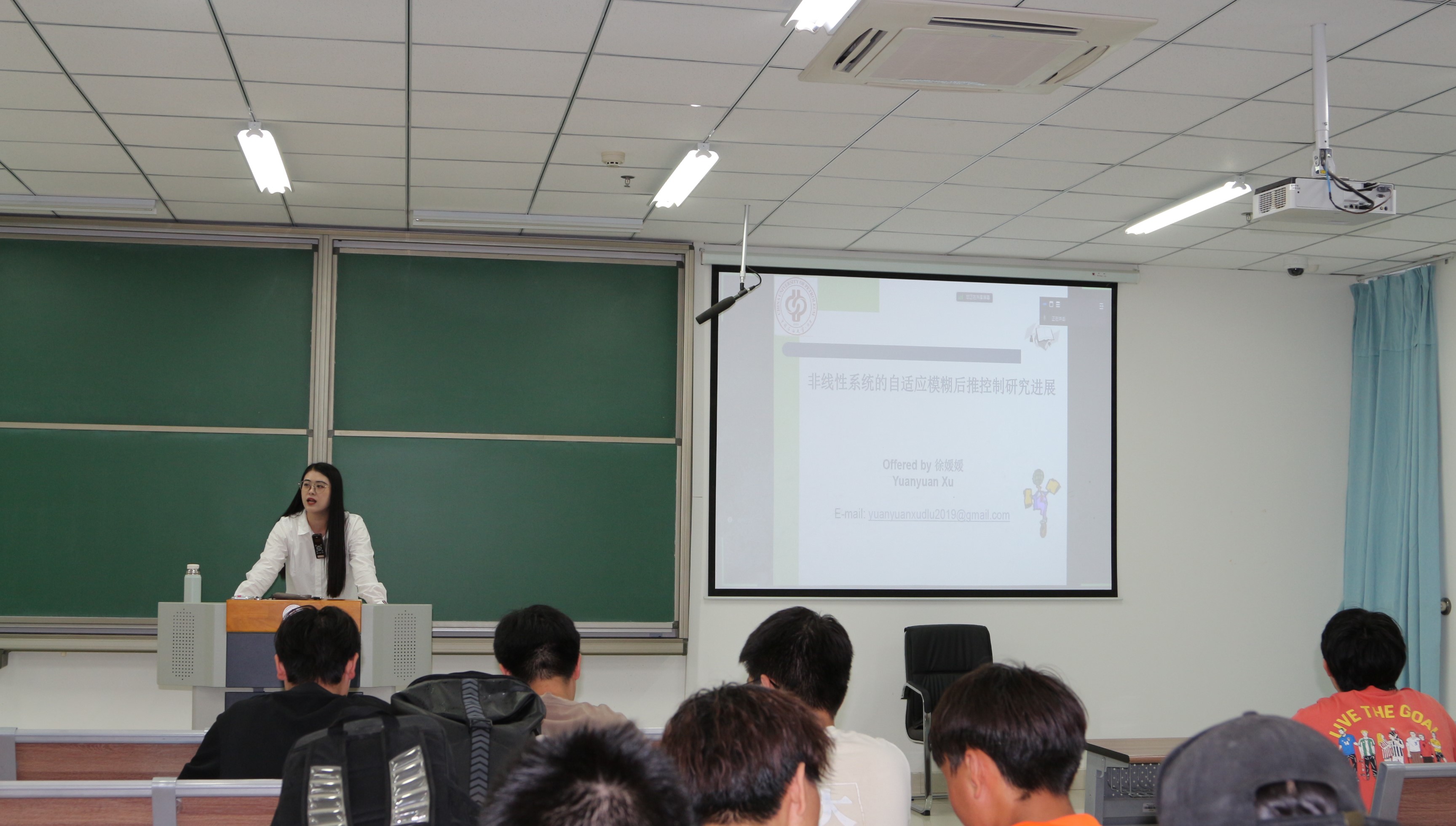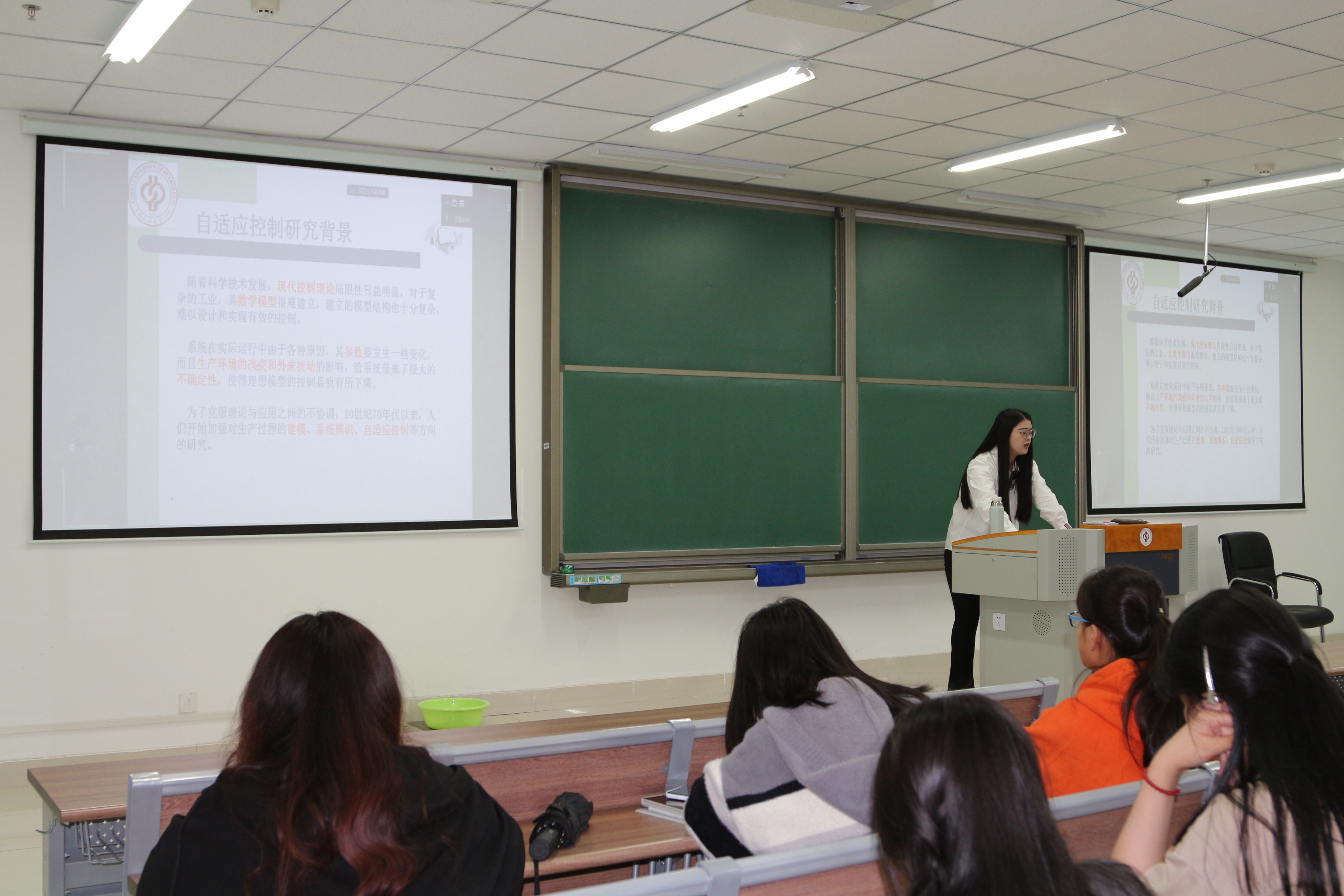讲座过程中,徐媛媛首先介绍自适应控制的研究背景,用视频举例了一些自适应控制方法,用板书讲解了反步后推控制,之后进入正题,深入浅出地阐述了模糊控制基本原理、稳定性与李雅普诺夫方法,并结合自身研究成果,详细介绍了非线性系统的自适应模糊控制研究进展,以及给在座的师生推荐了模糊控制领域内的TOP会刊,鼓励在座的学生在本科阶段发表高质量文章。
