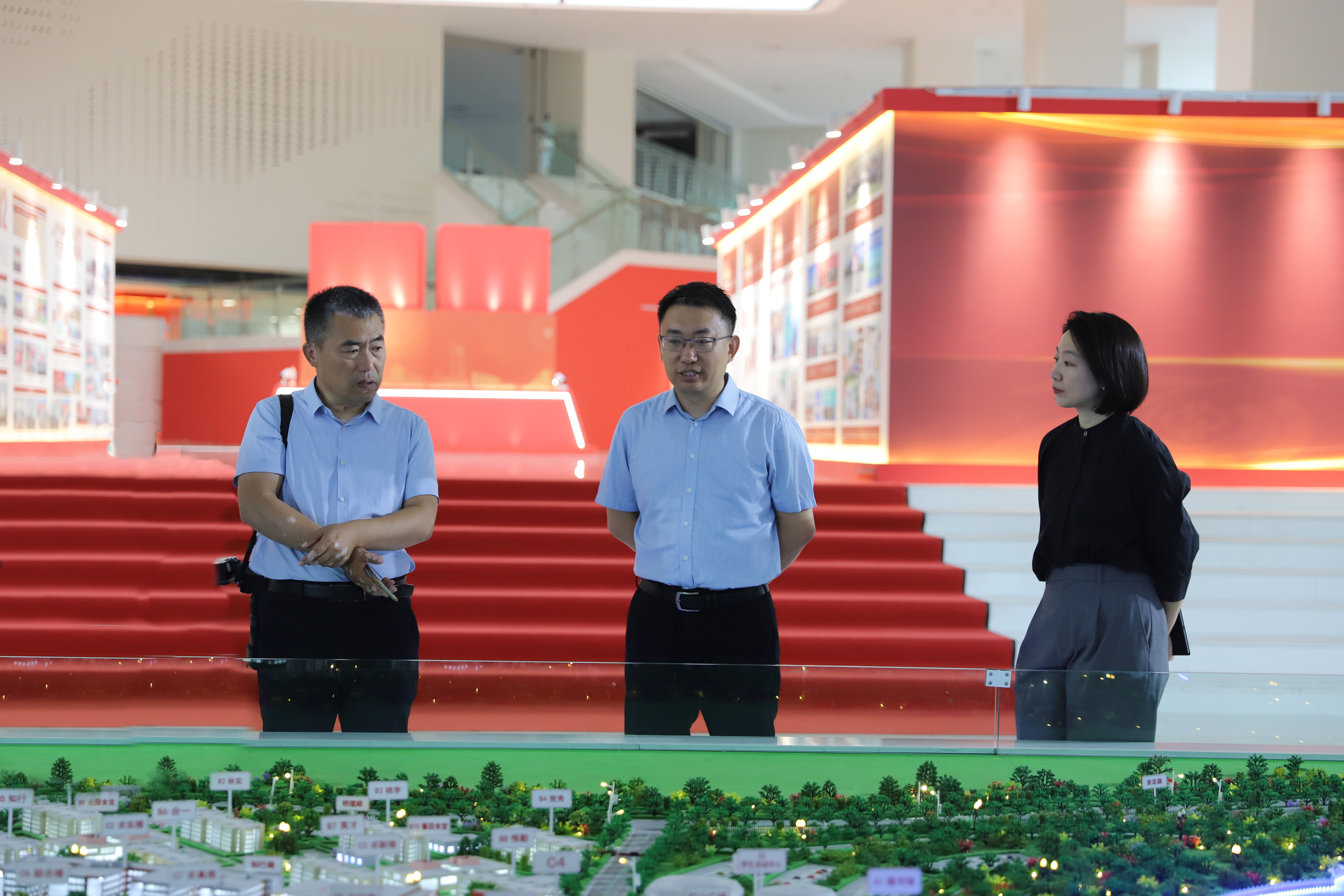 调研期间,訾波实地调研了学校办学成就展、校园全景沙盘、实训厂房、红山湖、图书馆等。