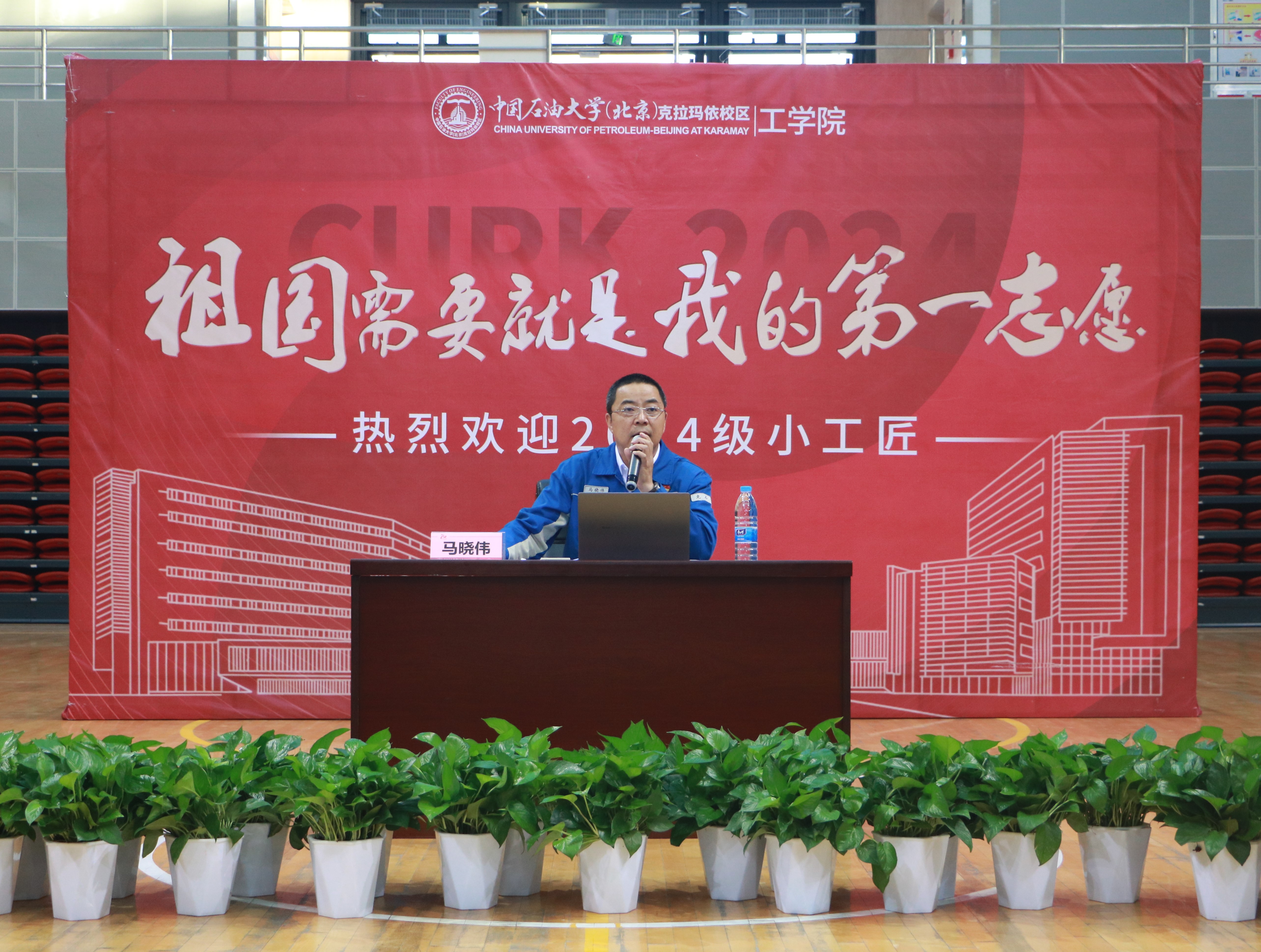 2024年9月5日,中国石油集团公司技能专家、新疆维吾尔自治区劳动模范、中国石油集团公司先进工作者、中国石油集团公司技能西部行特殊贡献、中国石油集团公司石油名匠、 “新疆工匠”称号获得者马晓伟在红山湖体育馆为工学院2024级新生举办工匠思政课。工学院2024级全体新生以及工学院辅导员现场聆听工匠思政课。工学院辅导员卢薇主持本次思政课。