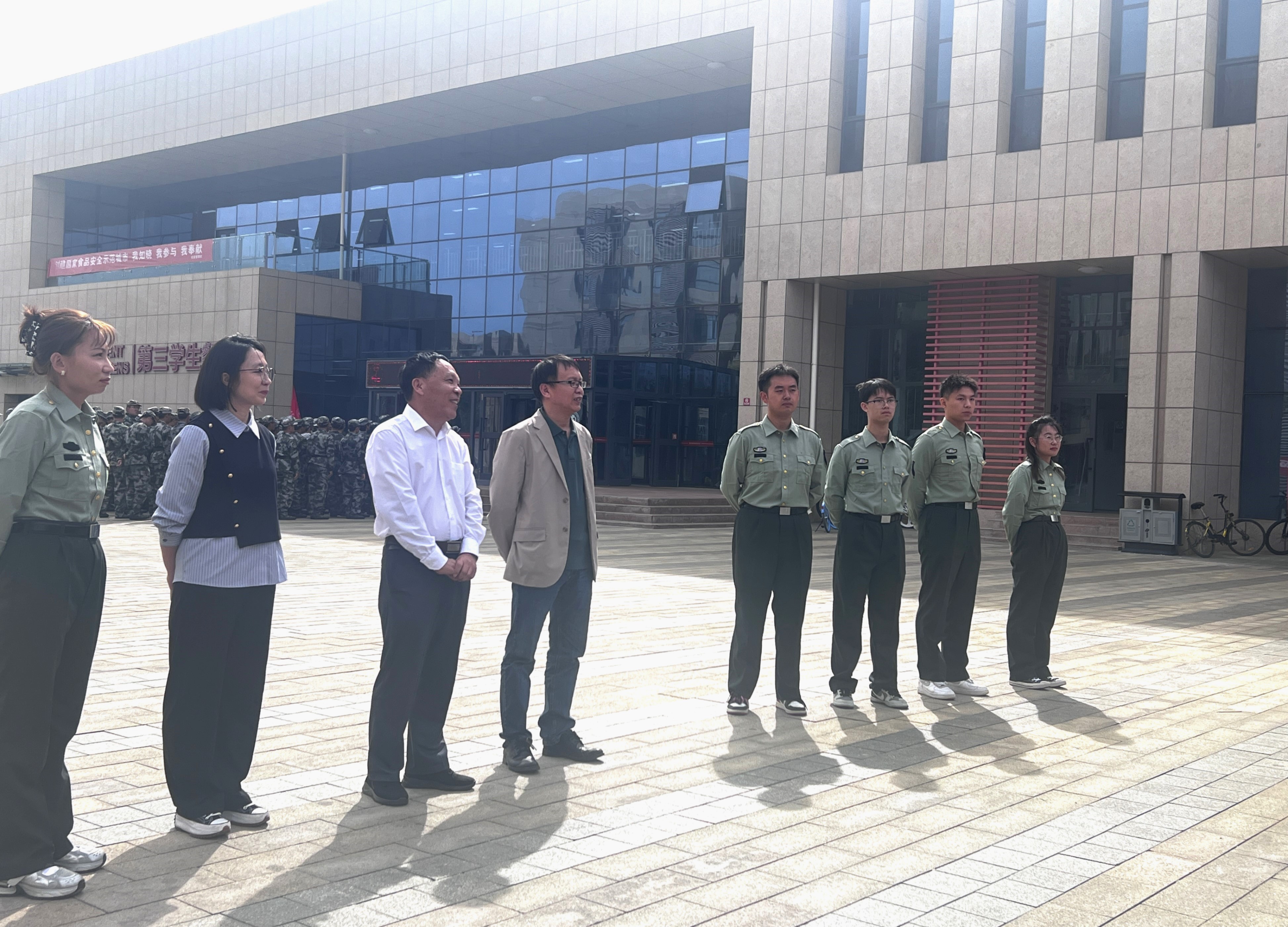 上午12:30,工学院领导对参加2024级新生军训的教官们进行了亲切慰问,表达了学院对教官们辛勤付出和无私奉献的高度认可和衷心感谢。