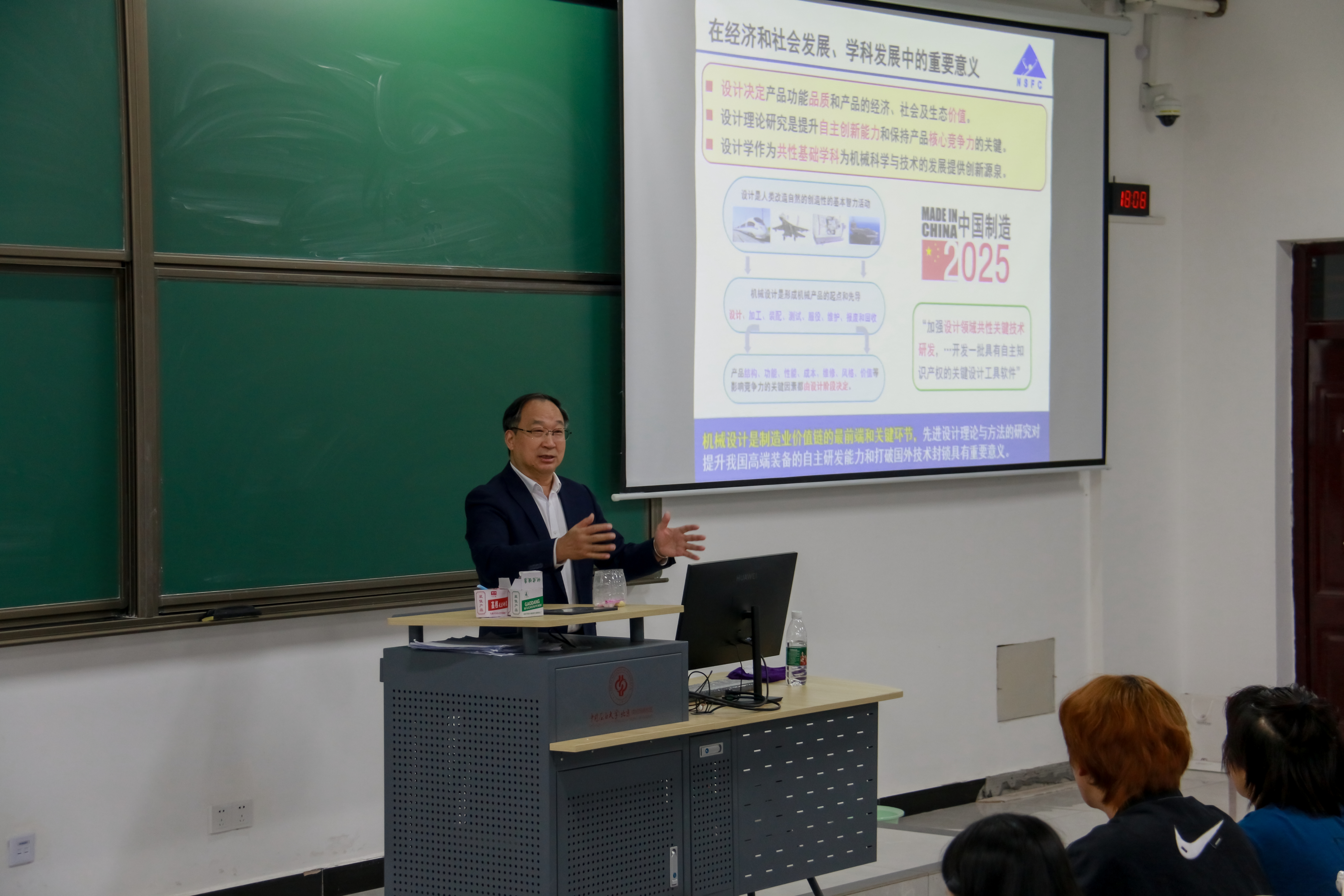 随后,黄洪钟向同学们介绍机械设计方法学的变革历程。从直觉设计时期到理论设计阶段,再至现代设计、智慧设计,让同学们清晰地认识机械设计学科的发展脉络。他表示设计方法学研究边界宽广,着重强调面向基本共性问题的设计方法、基于信息技术的设计方法、基于资源环境的设计方法三个要点,为同学们拓展了学术视野。