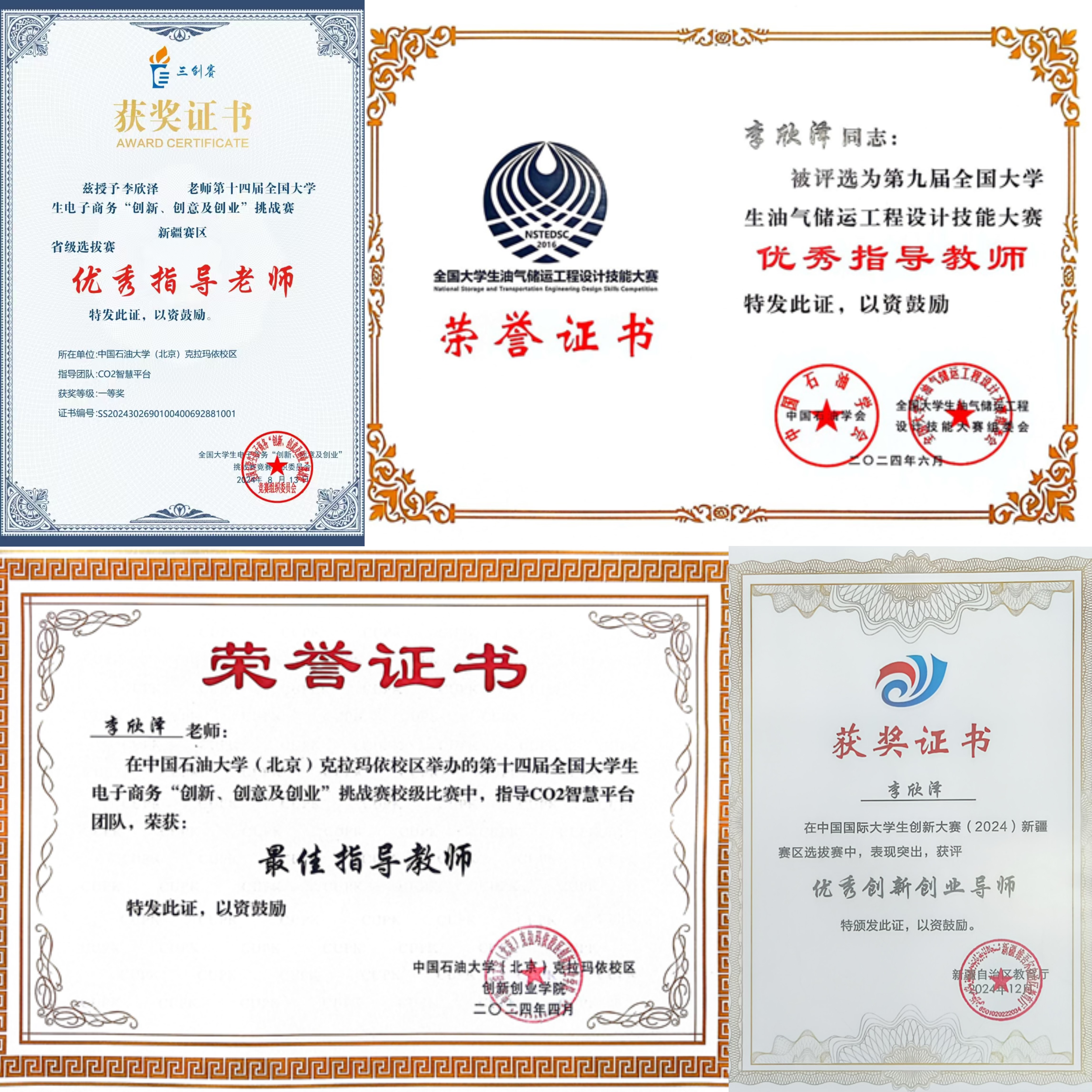 李欣泽现担任工学院储运22-2班班主任,获评“优秀毕设指导教师”称号;作为科研导师,指导8名储运创新班学生开展科研训练,共同申报发明专利3件;培养研究生8名,1名研究生获2024年自治区研究生科研创新项目立项;指导学生连续2年获得大学生创新创业训练计划项目国家级项目立项;指导学生创新创业作品在第十四届“挑战杯”自治区大学生创业计划竞赛、中国国际大学生创新大赛(2024)、第十四届全国大学生电子商务“创新、创意及创业”挑战赛等荣获国家级金奖1项、铜奖2项、省部级金奖3项;指导学生专业设计作品在第九届全国大学生油气储运工程设计技能大赛荣获一等奖;获评自治区优秀创新创业导师、全国大学生油气储运工程设计技能大赛优秀指导教师。