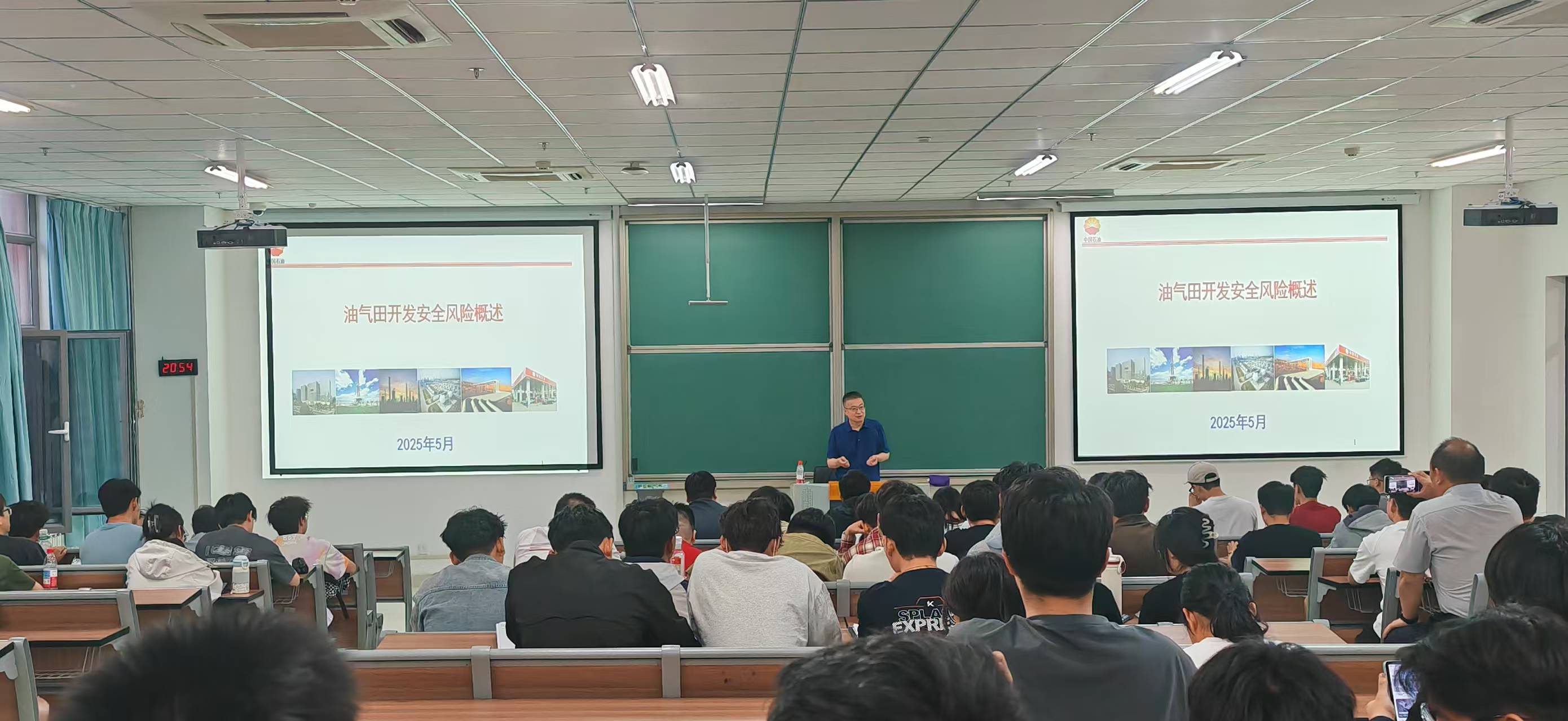 郝卫国结合自身工作经历,分享了对安全工作的认识和理解,以现场实际案例,生动阐释安全生产、事故隐患、生产安全事故发生发展过程到应急抢险救援。从新疆油田基本情况引入,详细介绍了钻井工程、压裂作业、采油采气、油气集输处理、天然气储存等油气生产环节和连续油管作业、带压作业中的风险因素,最后针对石油企业新领域新要求,对学生们提出了如何应对新业态、新领域、新风险这一安全工作新挑战的思考。