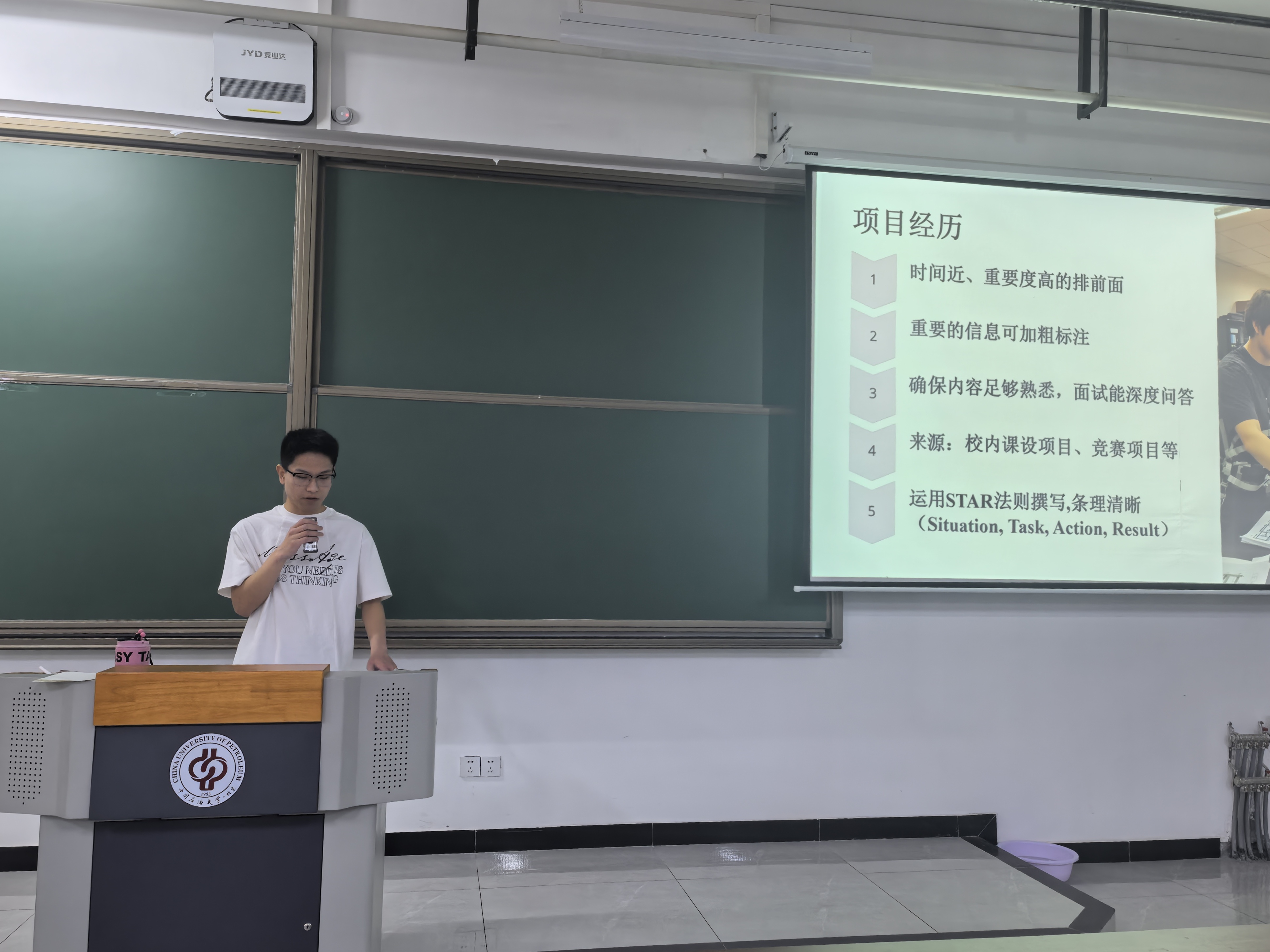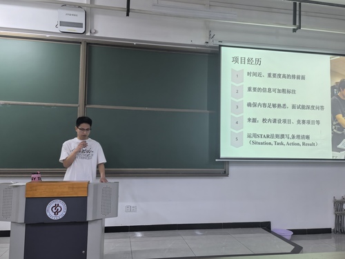 郑清阳,自动化21-2班学生,已签约华为技术有限公司,他的主题是简历制作与面试准备。郑清阳在重点讲解了如何通过突出个人优势制作出让面试官眼前一亮的简历后,介绍了有效的投递渠道、岗位选择方法、系统的面试准备策略,以帮助同学们提高求职成功率。