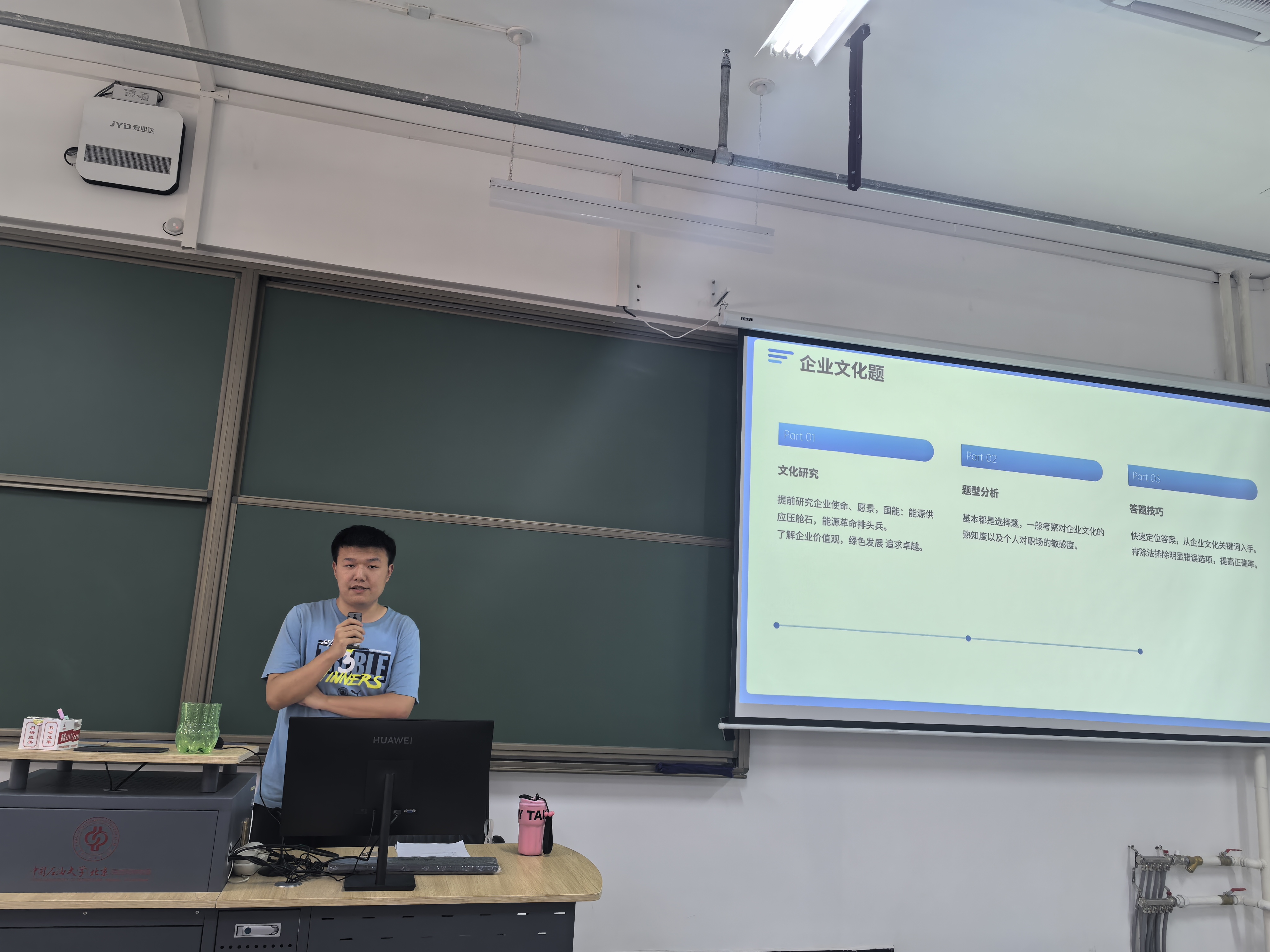 潘一帆,储运21-3班学生,已签约中海油天津分公司,他的主题是就业全过程赋能。潘一帆推荐了三桶油选岗的实用小程序—油考雷达,随后他分享了笔试复习技巧,强调应重点复习企业精神文化、找规律、分析计算题。最后,潘一帆介绍了面试的流程及重点。