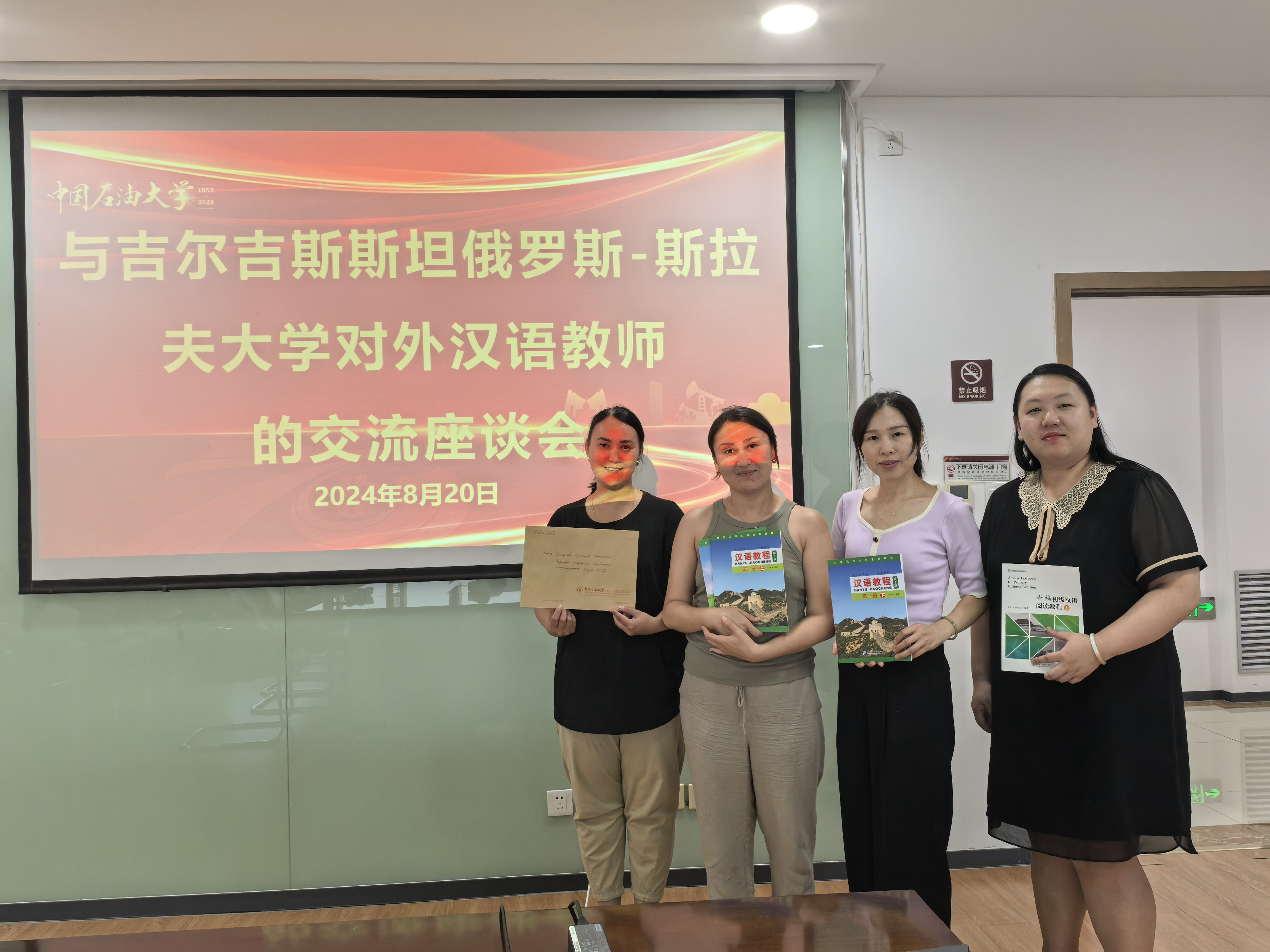 会后,杨妍副院长代表校区向两位教师赠送了五本国际汉语教程,并合影留念。