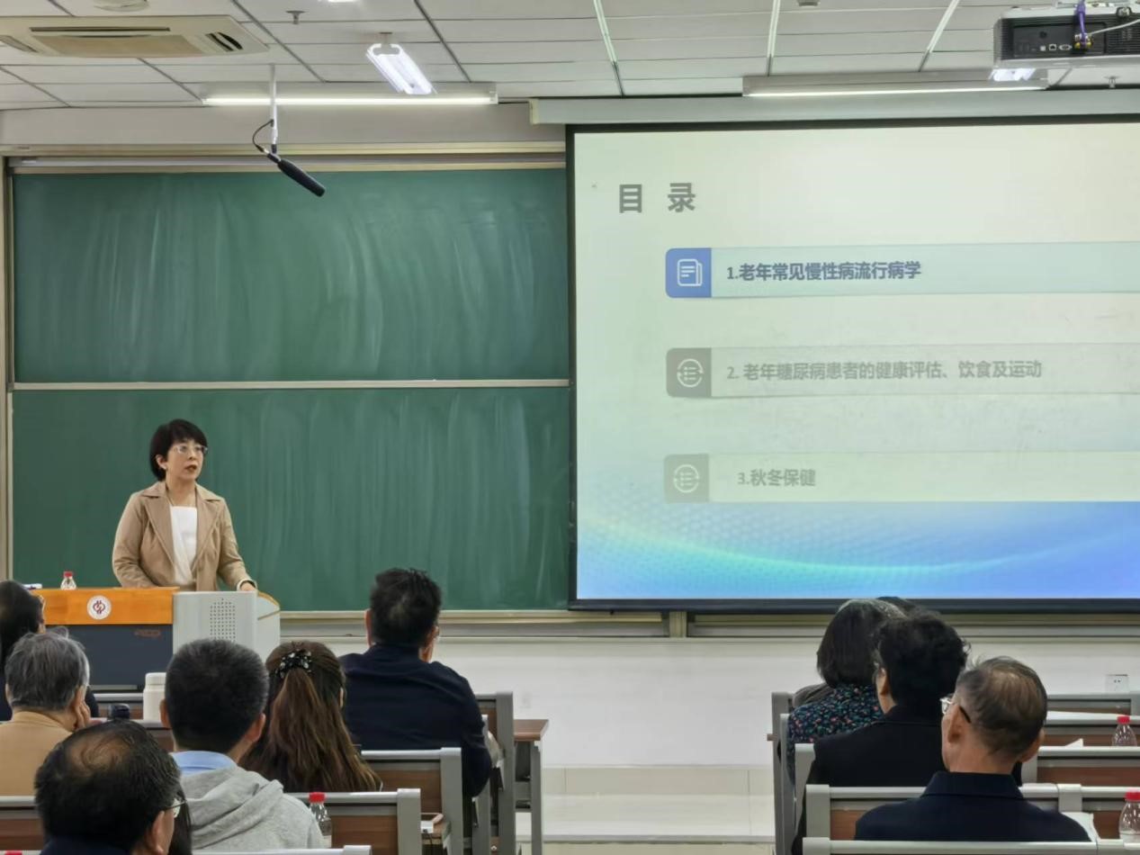 老年慢性病具有起病慢、病程长、病因复杂等特点,王宁主任用通俗易懂的方式讲解了其流行病学相关基础知识。她指出,预防老年慢性病、流行性疾病及糖尿病,需注重日常生活习惯,均衡饮食,适量摄入富含蛋白质、维生素等营养物质的食物;进行适量运动,如散步、太极拳等;同时定时体检,关注自身健康状况。随后,王宁分享秋冬养生保健相关知识,从中医角度看,介绍了秋冬养生的注意事项。