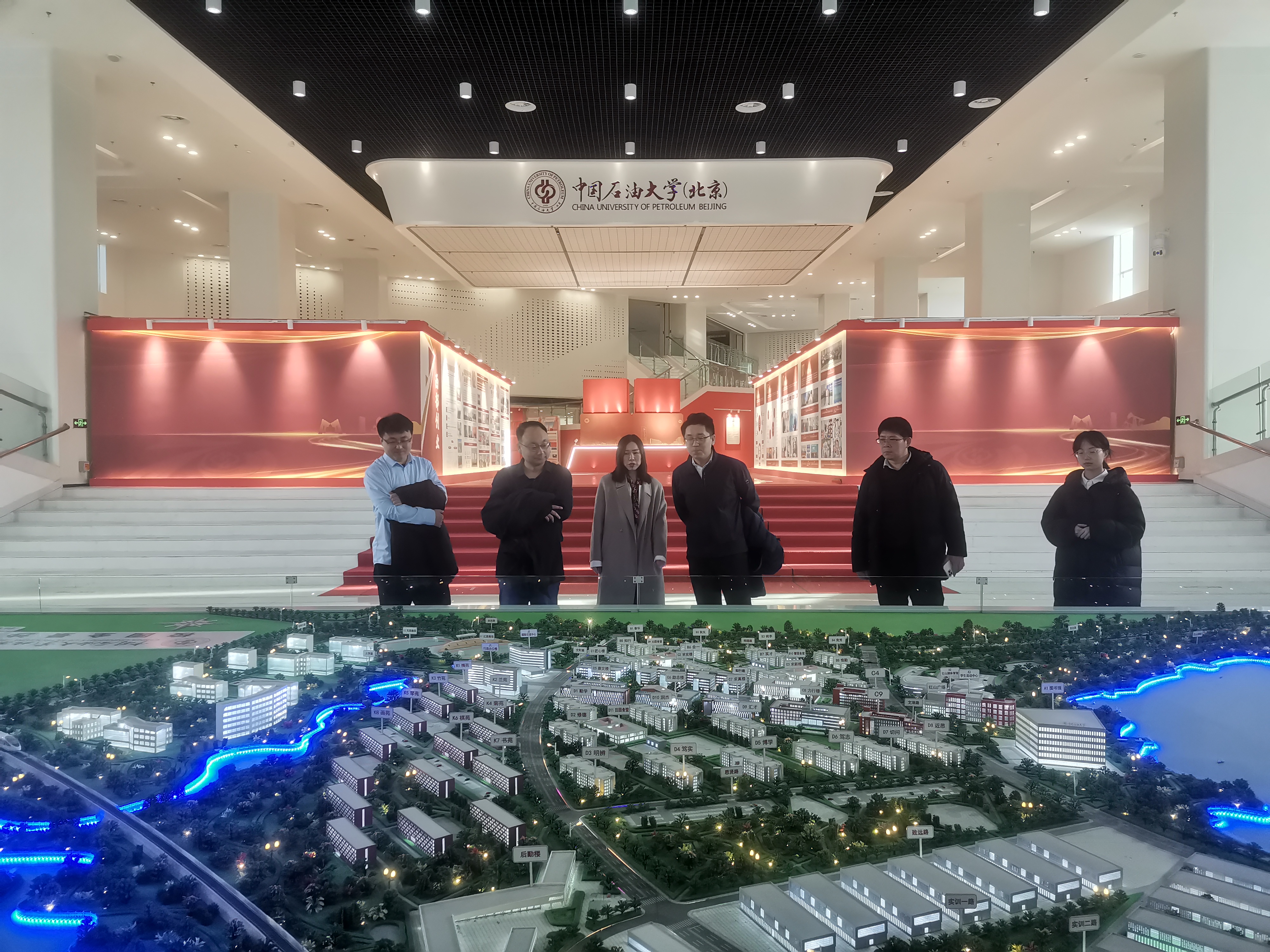 调研期间,中国地质大学(北京)一行实地参观了学校办学成就展、校园全景沙盘、红山湖、图书馆和体育馆。