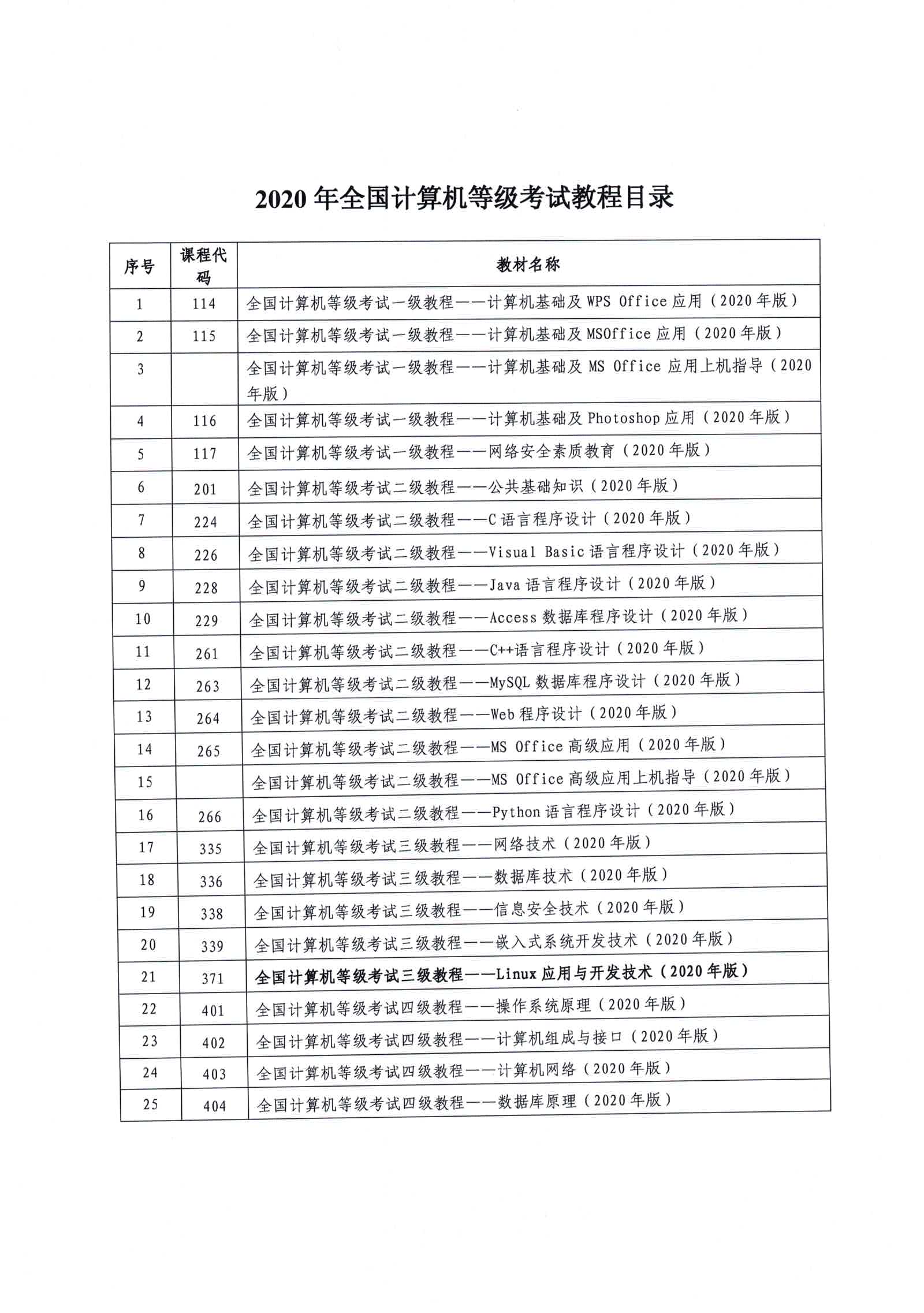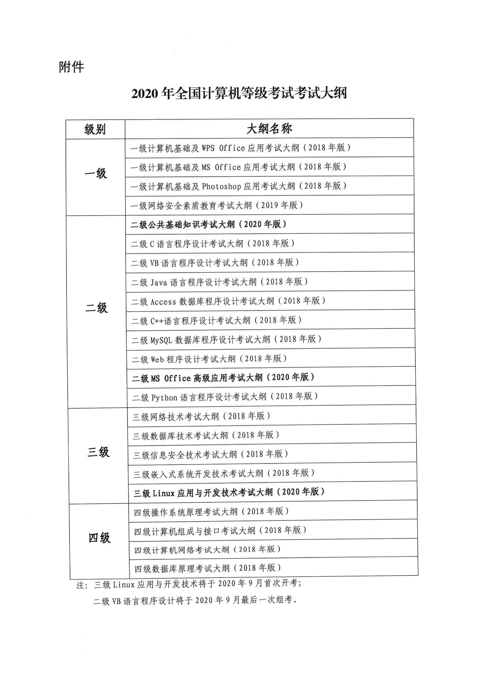 2020年对部分科目考核大纲进行了修订,相关科目教程有关更新,大纲及教程目录详见《2020年全国计算机等级考试考试大纲》及《2020年全国计算机等级考试教程目录》。