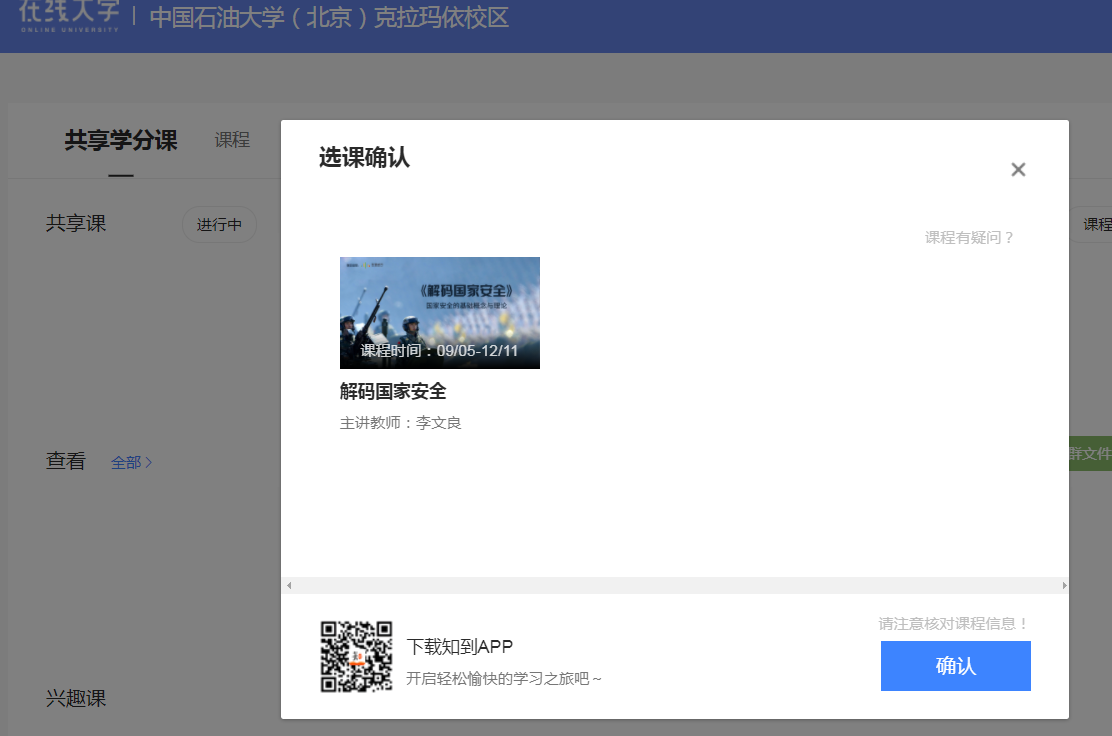 学生在登录账号后会弹出课程确认窗口(界面如下图所示),学习前须完成课程确认。如遇未弹出课程确认窗口的情况,请先检查学号、姓名等个人信息是否正确。手机端无法确认课程时,可尝试在电脑端登录确认课程或直接联系智慧树客服解决。