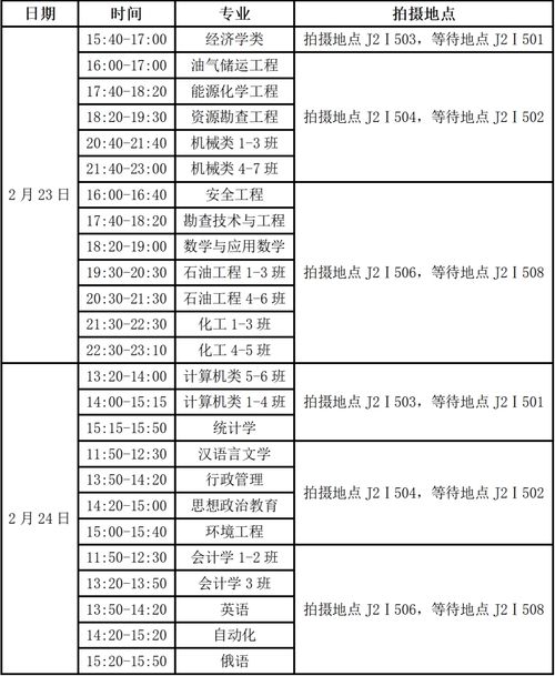 备注:请尽量在指定的时间段内完成拍摄,如课程、考试安排与指定时间段冲突,可在其他拍摄时间段内拍摄,也可于2月24日12:00-13:20到J2Ⅰ503拍摄。