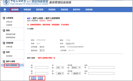 2.父母或监护人信息填报:登录教务系统,点击“信息服务”-“监护人信息填写”,可填报父母双方信息,也可只填报一方信息,填写并确认无误后点击提交(详细流程见附件)。
