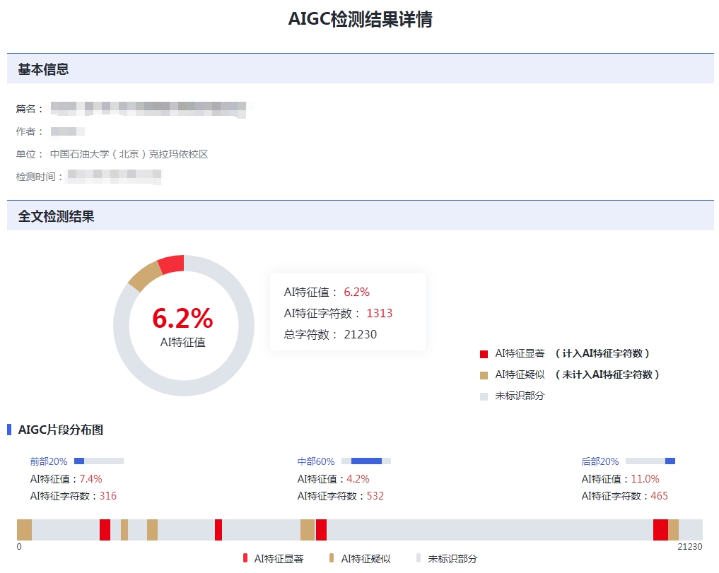 校区使用的“中国知网”大学生论文检测系统(cupk.check.cnki.net)已部署“知网AIGC检测系统”,学生正常进行查重检测,无需进行额外操作。经指导教师审阅同意,学生将论文上传至知网查重系统进行首次查重检测时,“知网AIGC检测系统”同步对论文进行AIGC检测。检测完成后,学生、指导教师、学院管理员均可查询到AIGC检测结果,见下图。