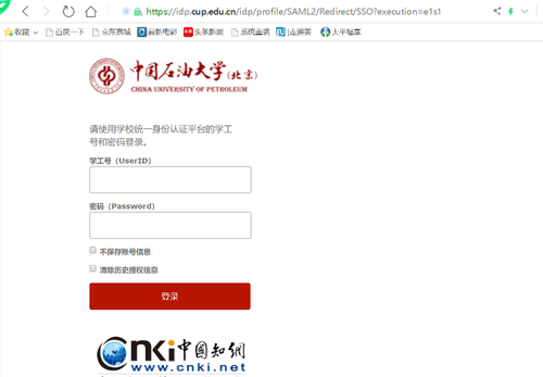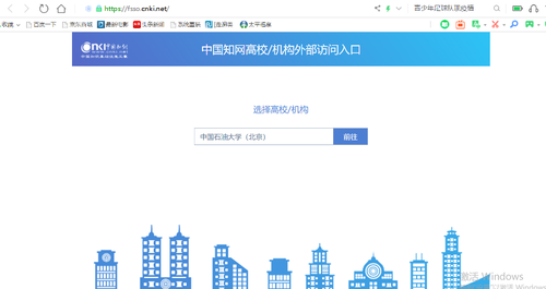 1、 在校园网外(非校园IP地址)打开浏览器,输入https://fsso.cnki.net/,选择高校/机构“中国石油大学(北京)”,点击“前往”。