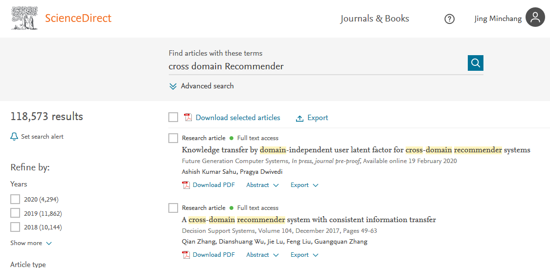 点击“获取访问权限“后,跳回ScienceDirect界面。 您可以选择匿名继续访问,或者立即登陆,以方便后续使用。 检索文献后,只要文献后出现“Download PDF”,即是注册和登录成功,可以下载全文了!