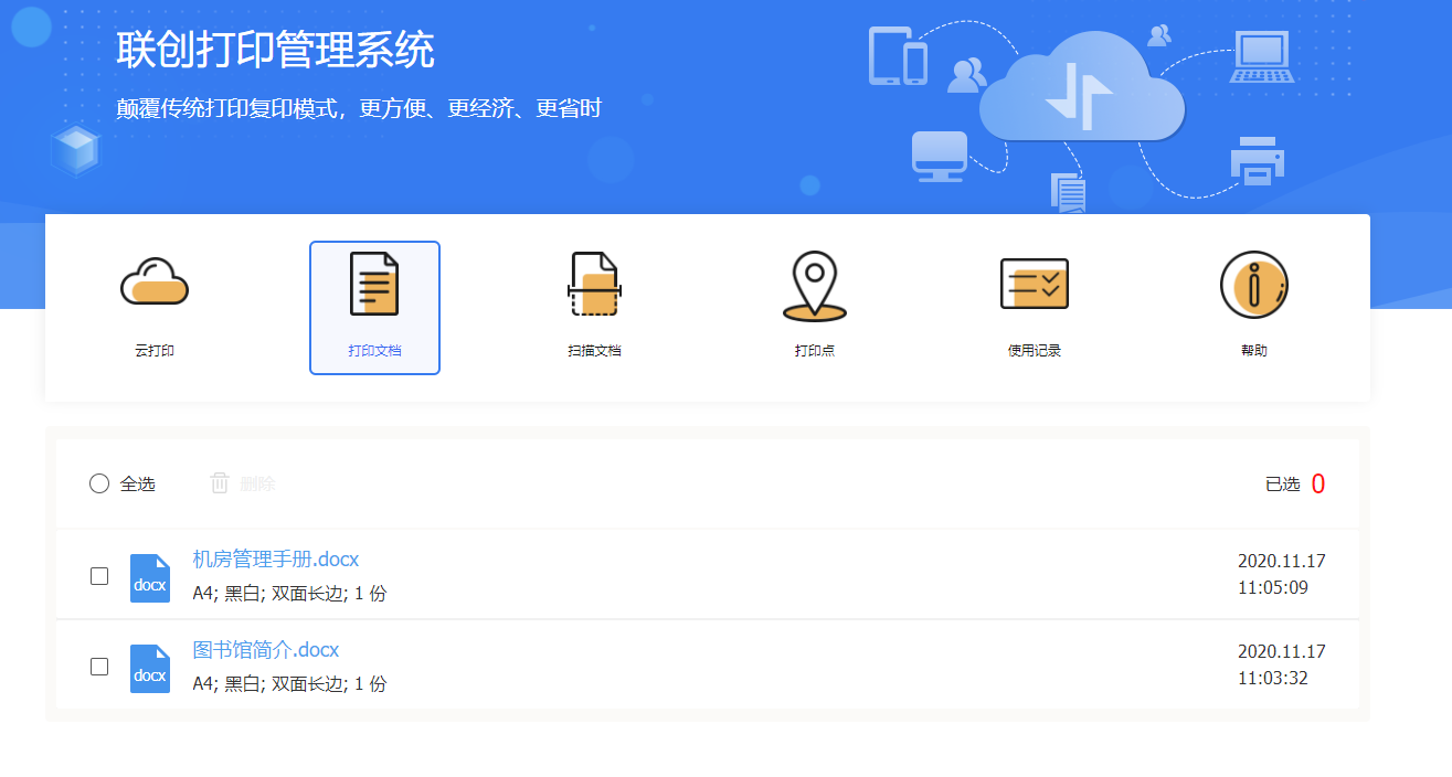 上传文档成功后,网页会自动跳转到打印文档页面,可以点击文件进行预览,或者对上传有误的文档进行删除。