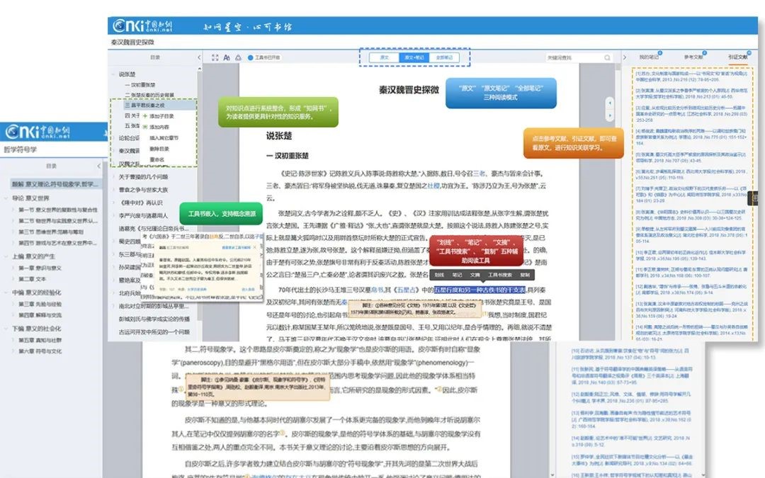 与现有线上阅读平台不同,“心可书馆”通过增强数字出版,为读者带来全新阅读体验。一方面提供丰富的在线数字化阅读学习功能,包括笔记、划线、重要内容摘录、学习成果汇编、内容重组整理、工具书嵌入、知识溯源等,帮助读者进行知识梳理、读懂学透,实现“先读厚,再读薄”。另一方面,支持在线创作和编辑,不仅可以在线梳理所学知识,总结编写研学心得体会,也为著书写作提供支持,包括自动精准生成参考文献和引文、注释链接等。