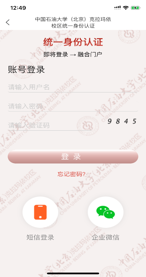 3. 在输入校区代码或点击校区名称后会弹出校区融合门户的页面,输入门户账号和密码即可: