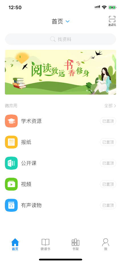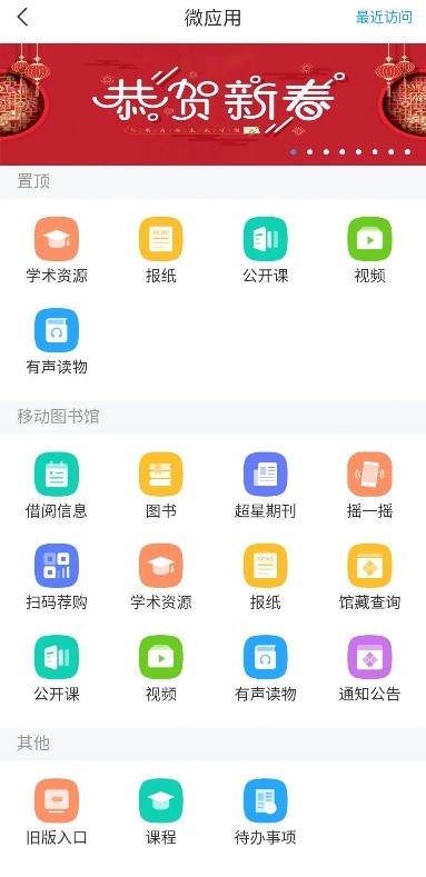 首页微应用:登录升级后的移动图书馆app后,默认显示的首页微应用为部分置顶应用及最近访问模块。