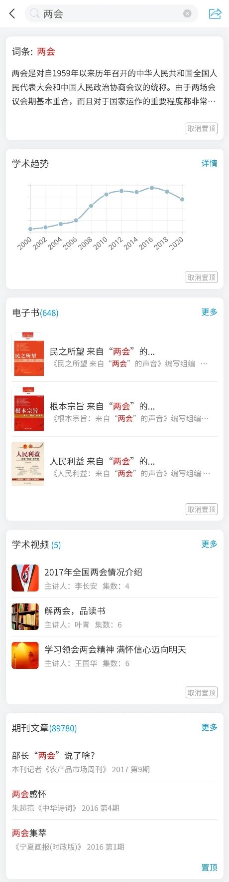 一站式资源搜索:点击首页搜索框,输入关键词,“搜索”即可进入结果页面。如之前检索过内容,则会展示最近搜索词,点击搜索词可直接跳转至搜索结果页面,同时可一键删除搜索记录。