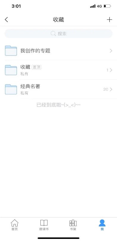 收藏:集中管理用户收藏读物的模块。用户可将应用内个人喜爱的阅读资料收藏至书房,方便细细品读。被收藏资源以列表形式排列展现,用户可以点击查看阅读。列表的每一行会显示相应的名称,文件夹右侧会显示其中的数量。顶部搜素框用于快速搜索收藏的读物。点击右上角的“+”按钮,可选择新建文件夹与批量编辑。