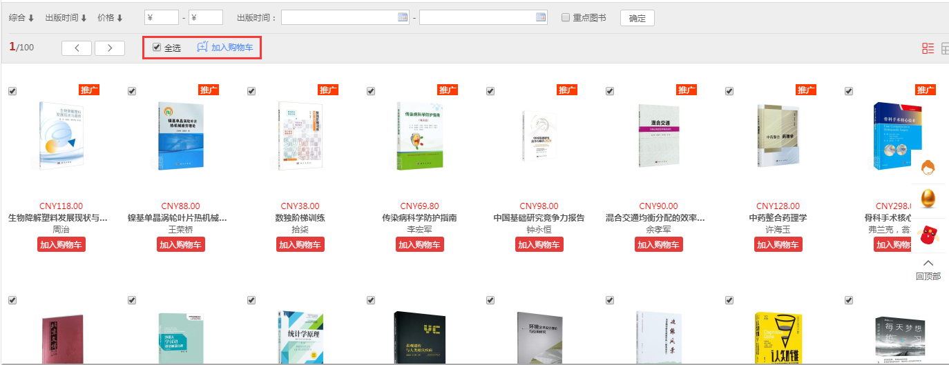1.1、系统可按图书的出版时间、定价排序。也可按价格区间、出版时间段、重点图书【即图书馆关注的重点出版社】进行筛选。