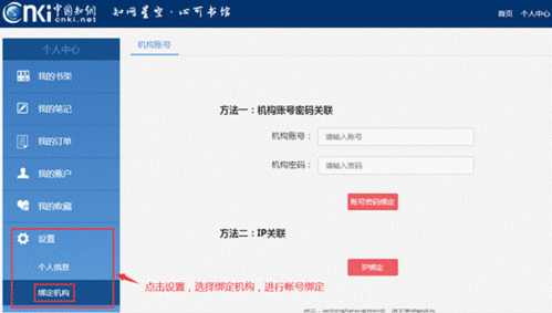 进入首页后登录个人账号(使用在知网首页或知网研学注册的个人账号)后,进入“个人中心”,点击“设置”——“绑定机构”,选择IP关联点击“IP绑定”。