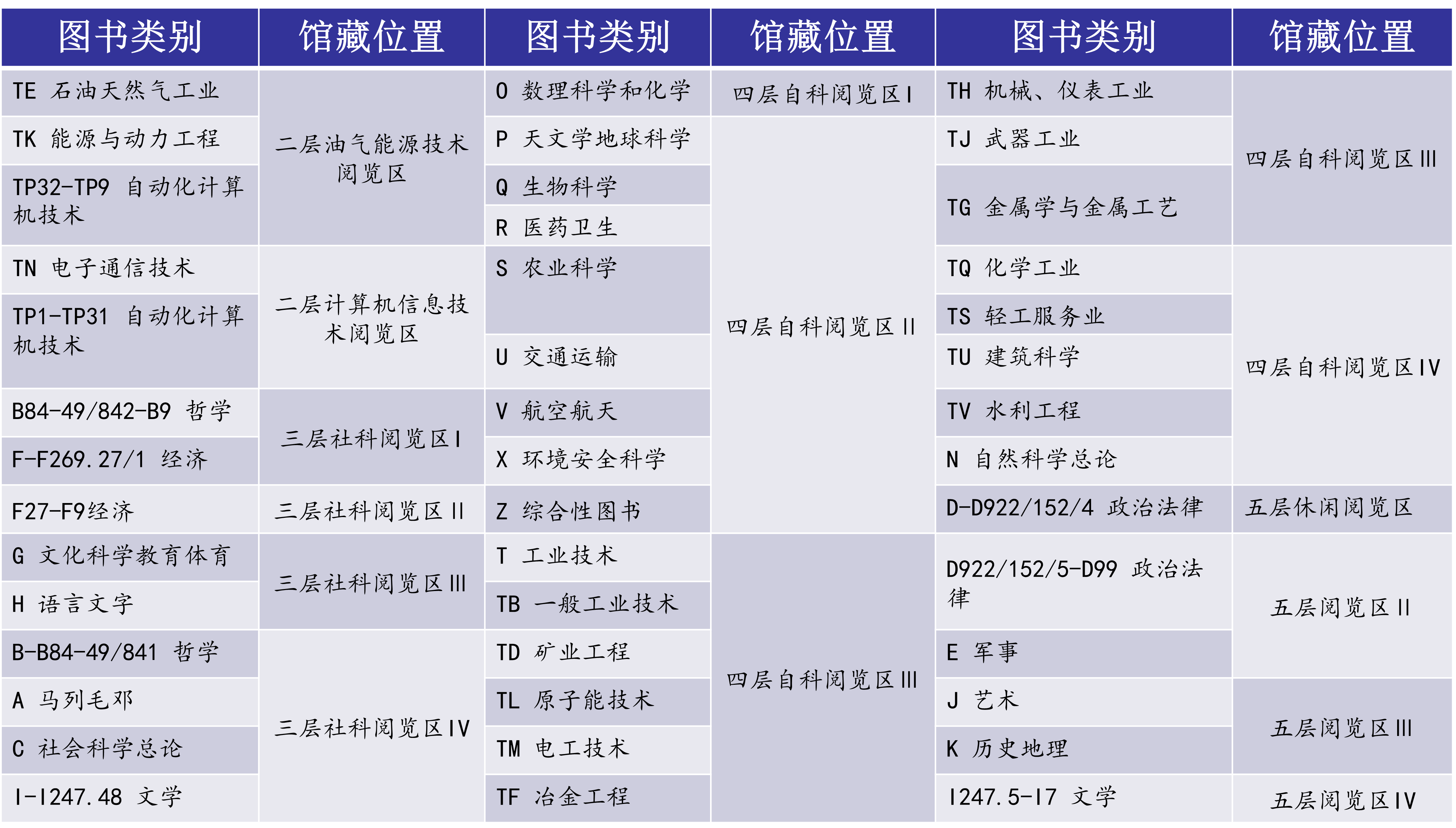 计算机信息技术阅览区,油气能源技术阅览区,自然科学阅览Ⅰ区、Ⅱ区、Ⅲ区、Ⅳ区,社会科学阅览Ⅰ区、Ⅱ区、Ⅲ区、Ⅳ区,三层休闲阅览区、五层阅览区和期刊杂志阅览区。