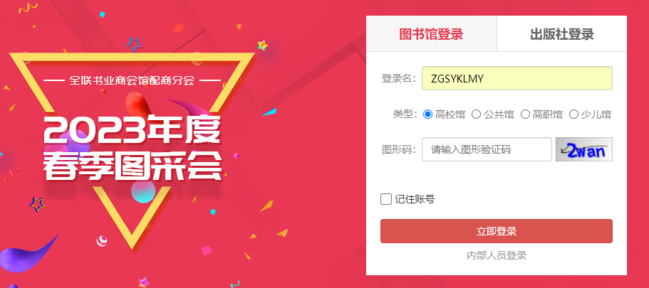 荐购者(老师或学生):选择【图书馆登录】→输入用户名【ZGSYKLMY】→选择单位属性【高校馆】→输入【图形码】即可登录。