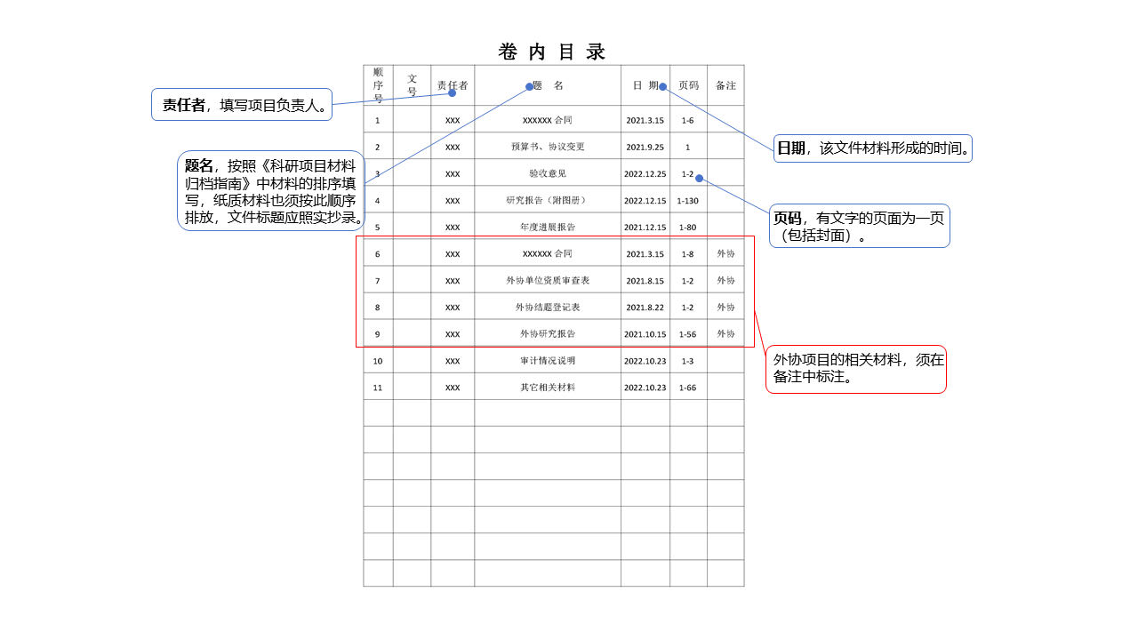 每份科研项目必须提交《卷内目录》、《卷内备考表》,填写规范如下: