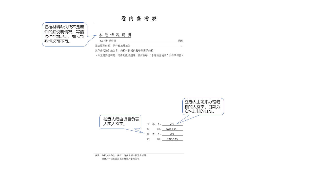 ※归档材料要求原件归档;确实无法提供原件的,复印件归档时要对照原件加盖公章;无原件且无法加盖公章时,请在卷内备考表中写明复印件归档原因、原件存放单位地址及相关联系方式等信息。