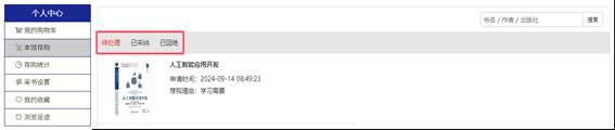 4、我的荐购:【个人中心】→【我的荐购】 中可查看到所有的荐购书目,及图书馆的采纳情况。