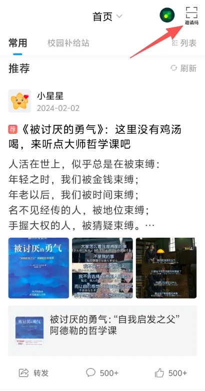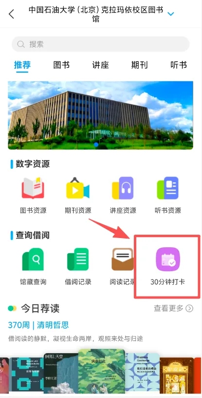 Step3 :注册完成后进入app首页,右上角输入邀请码“zsdktsg"后进入图书馆专属页面,点击“30分钟打卡”模块,即可报名参与活动;