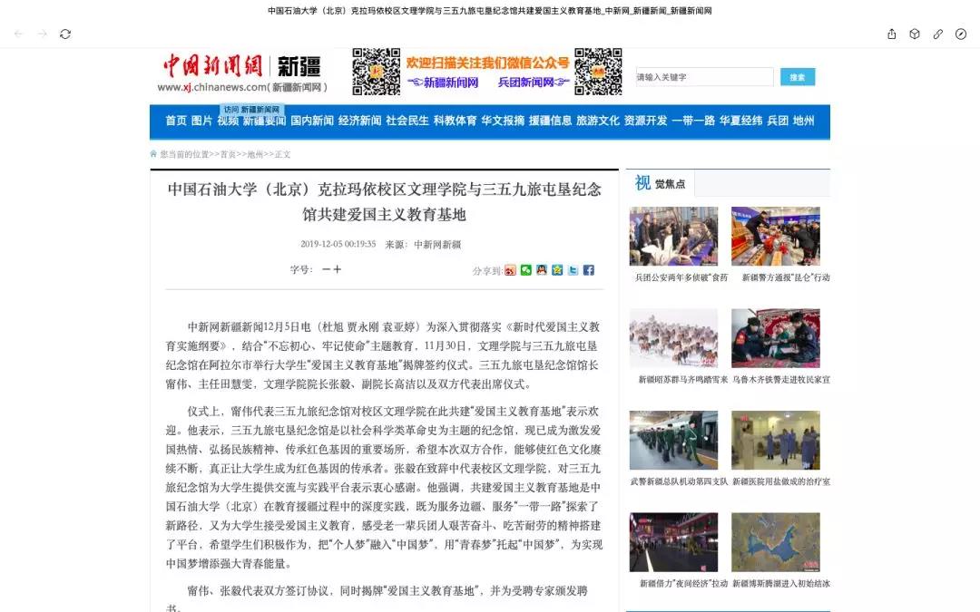共建爱国主义教育基地是中国石油大学(北京)在教育援疆过程中的深度实践,既为服务边疆、服务“一带一路”探索了新路径,又为大学生接受爱国主义教育,感受老一辈兵团人艰苦奋斗、吃苦耐劳的精神搭建了平台,希望学生们积极作为,把“个人梦”融入“中国梦”,用“青春梦”托起“中国梦”,为实现中国梦增添强大青春能量。