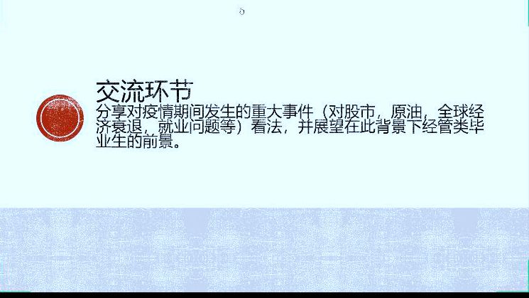 本次团日活动共分为五部分。熊卫、付璇在讲话中对当代大学生在疫情期间所展现出的坚韧品质表示了肯定,并对同学们日后的学习生活提出了更进一步的要求。随后,焦婷婷同学与在疫情中身处湖北、新疆的两校同学们分享了自己在假期中的学习经验,讲述了在这段特殊的日子里的反思与提高。作为商科类大学生,参会学生在此次疫情中全球经济低迷的形势下,也对自身的职业未来进行了思考和对当前国际形势下全球经济的变化展开了讨论。