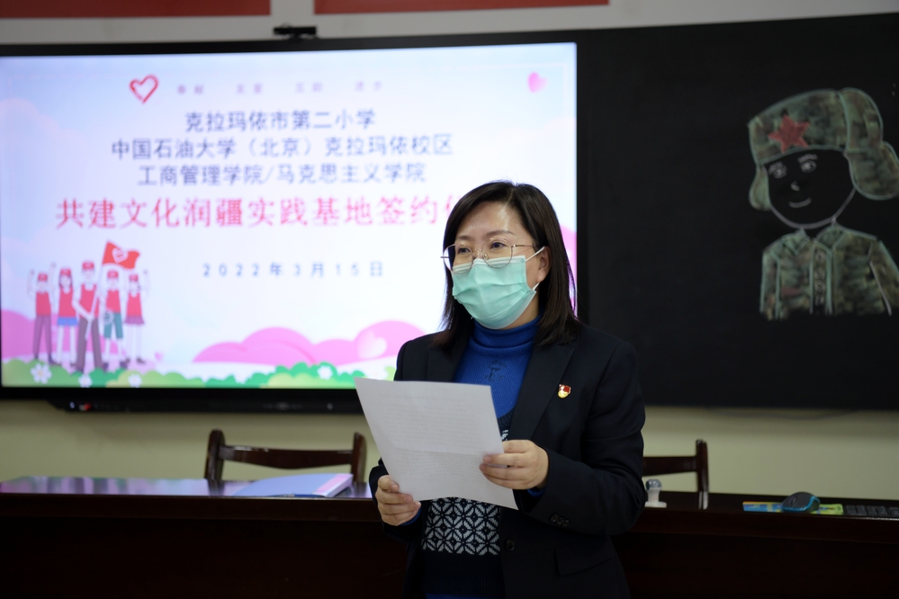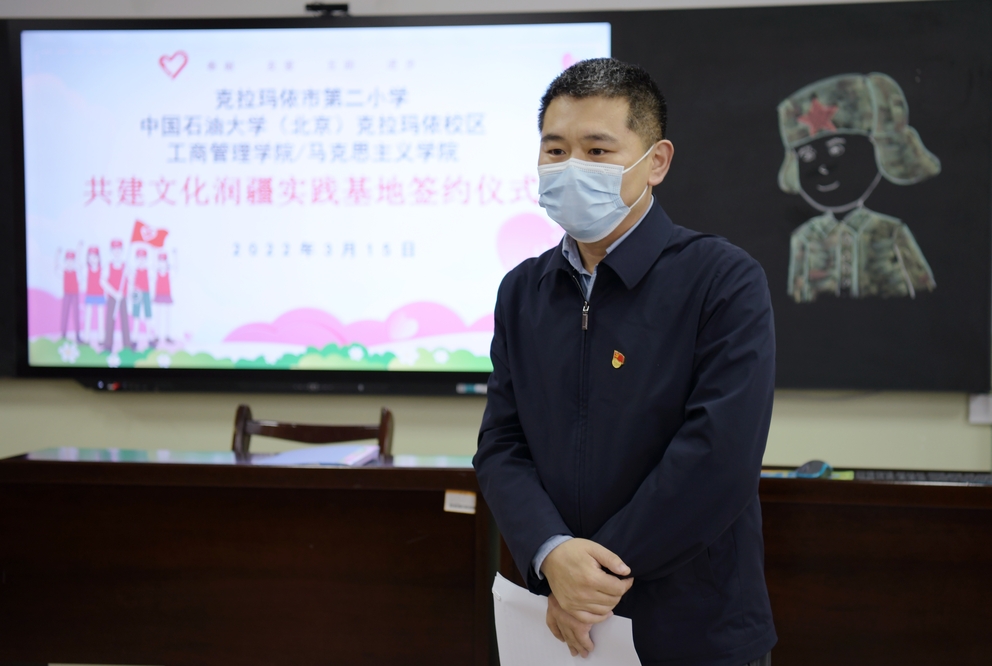 3月15日,工商管理学院/马克思主义学院在克拉玛依市第二小学举行文化润疆实践基地和党员先锋实践基地挂牌仪式。学院党委书记刘焕礼、团总支书记费葳葳,克拉玛依市第二小学党支部副书记刘君、副校长张璇、德育主任唐春艳、大队辅导员李芳和大学生志愿者代表参加活动,活动由志愿者牛子梦主持。