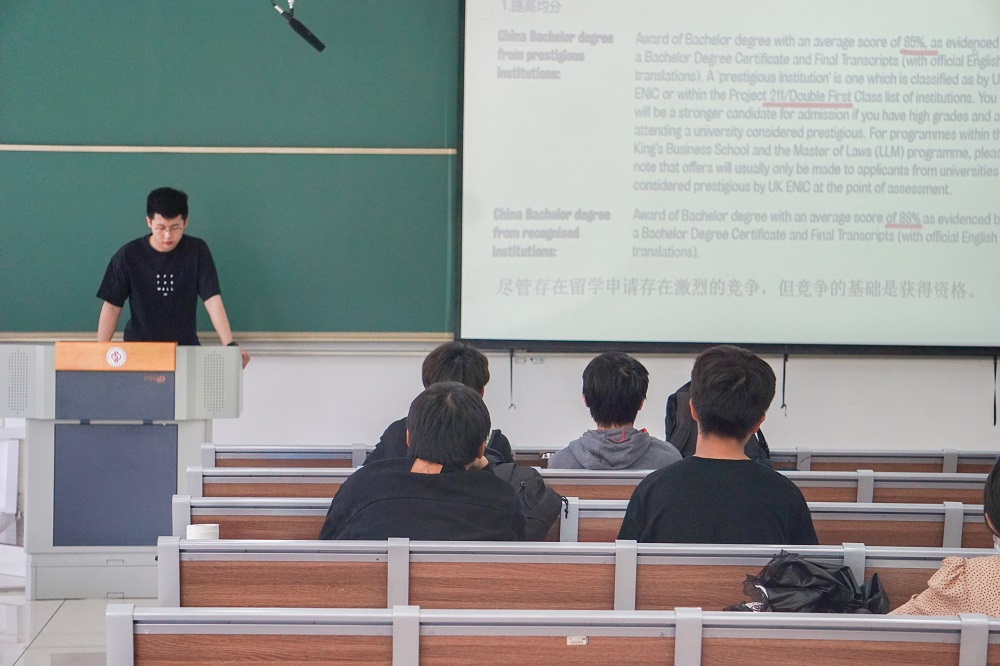 为帮助学生加强对英语语言考试的了解、做好出国留学规划,5月27日下午,工商管理学院/马克思主义学院举办了商科留学申请经验交流讲座,邀请2018级金融专业王烁栋分享留学申请经验,王烁栋获得了布里斯托大学、格拉斯哥大学、曼彻斯特大学和伦敦国王学院的录取通知书。会计、经济和金融各专业同学参加讲座。