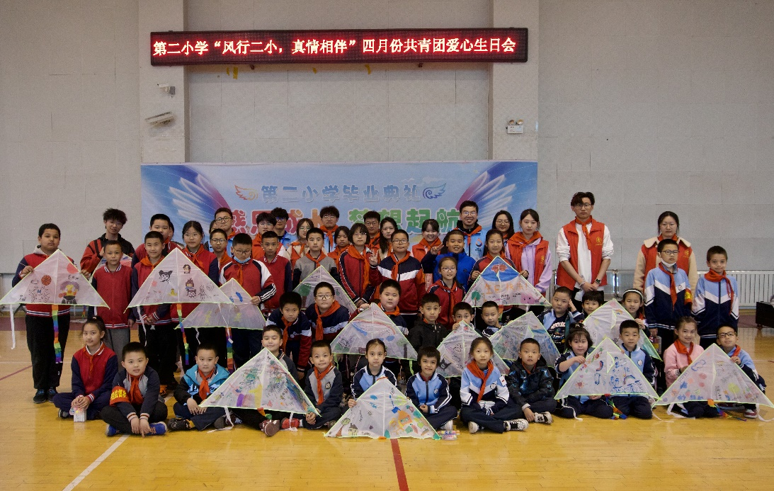 2023年4月11日,工商管理学院联合第二小学开展爱心生日会活动,为四月份出生的小学生们举办集体生日会,活动现场,小学生们为志愿者们佩戴红领巾,志愿者们为“小寿星”们齐唱生日快乐歌,送出美好祝福。大小学生们共同书写心愿,手绘风筝,放飞青春梦想,在欢快的氛围中感悟成长的意义。
