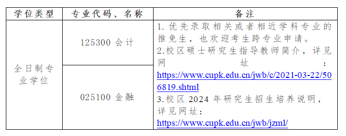 125300会计 | 1.优先录取相关或者相近学科专业的推免生,也欢迎考生跨专业申请。 2.校区硕士研究生指导教师简介,详见网址:https://www.cupk.edu.cn/jwb/c/2021-03-22/506819.shtml 3.校区2024年研究生招生培养说明,详见网址:https://www.cupk.edu.cn/jwb/jzml/ |