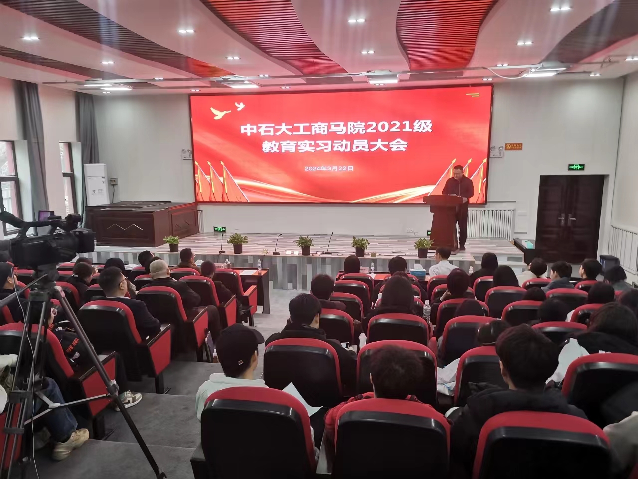 3月22日,全体思政学生在市教育局的组织下,于市教育局报告厅召开专业教育实习动员大会。出席会议的有工商管理学院/马克思主义学院院长丁英宏,副院长冯晓琦,学院党委副书记侯庆磊,马克思主义系主任晁娜娜,教育教学综合实习负责人李婧;克拉玛依区教育局党组成员、教育教学服务中心主任张和峰,克拉玛依市教育局人事科陈健,克拉玛依市第三中学副校长潘利军,各实习单位教师代表以及教育局相关工作人员,会议由陈健主持。