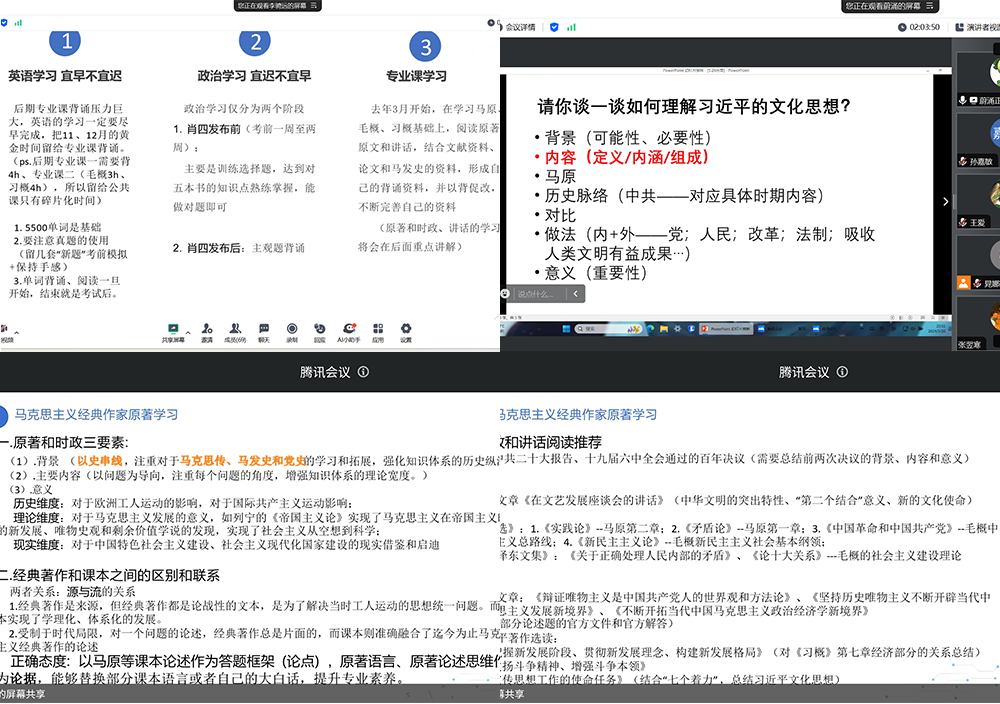 为进一步增强校区思政专业学生的备考热情,帮助同学们了解考研形势,5月26日,马克思主义系联合校本部马克思主义学院举办考研经验交流分享会。校本部马克思主义学院思政专业负责人杨关玲子,校区马克思主义系教师代表晁娜娜、孙嘉敏,校区思政专业全体学生,校本部思政专业部分学生等线上参加会议,会议由杨关玲子老师主持。