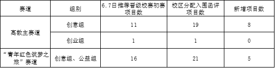 | 赛道 | 组别 | 6.7日推荐晋级校赛初赛项目数 | 校区分配入围函评 项目数 | 新增项目数 |