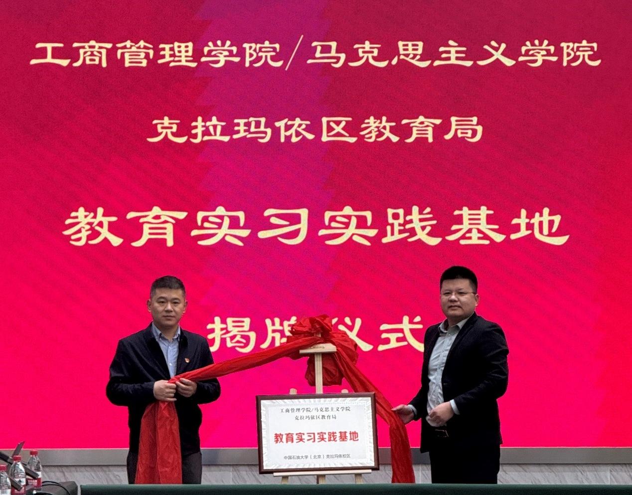 在全体与会人员的共同见证下,克拉玛依区教育局党工委副书记周华良与校区工商马院党委书记刘焕礼共同为教育实习实践基地揭牌。这一重要时刻不仅定格了校地协同育人的历史性画面,更搭建起理论教学与实践培养的贯通桥梁。